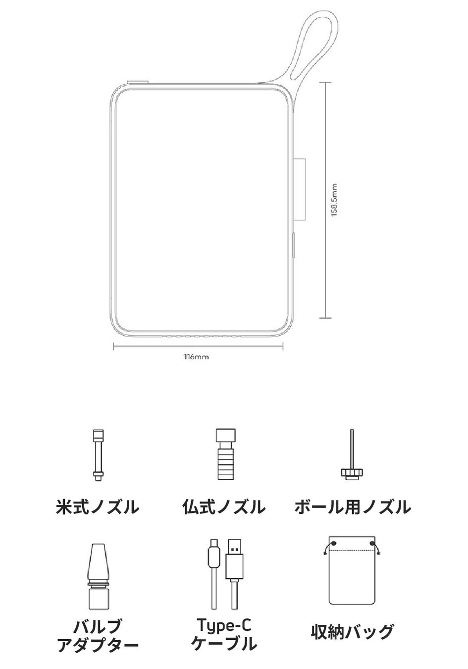 パッケージ内容 | ・本体 ・収納バッグ ・USB-Cケーブル ・米式ノズル ・仏式ノズル ・ボール用ノズル ・バルブアダプター ・説明書 ※USB-C電源アダプターは付属しておりませんので、別途ご用意ください。 |
