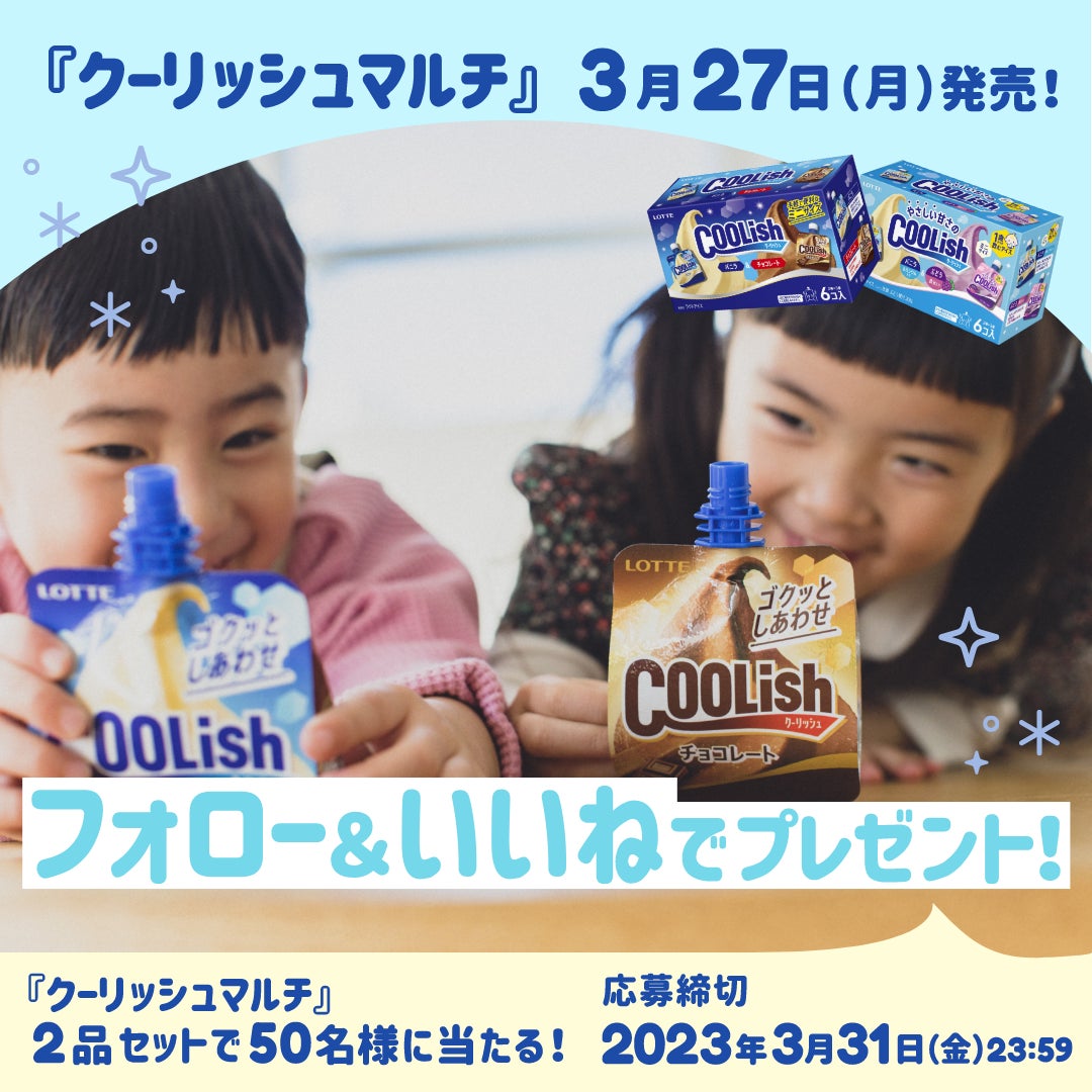 抽選でTwitter・Instagramそれぞれ50名様に「クーリッシュマルチ バニラ&チョコレート」1個と「やさしい甘さのクーリッシュマルチ バニラ&ぶどう」1個をセットでプレゼントいたします。