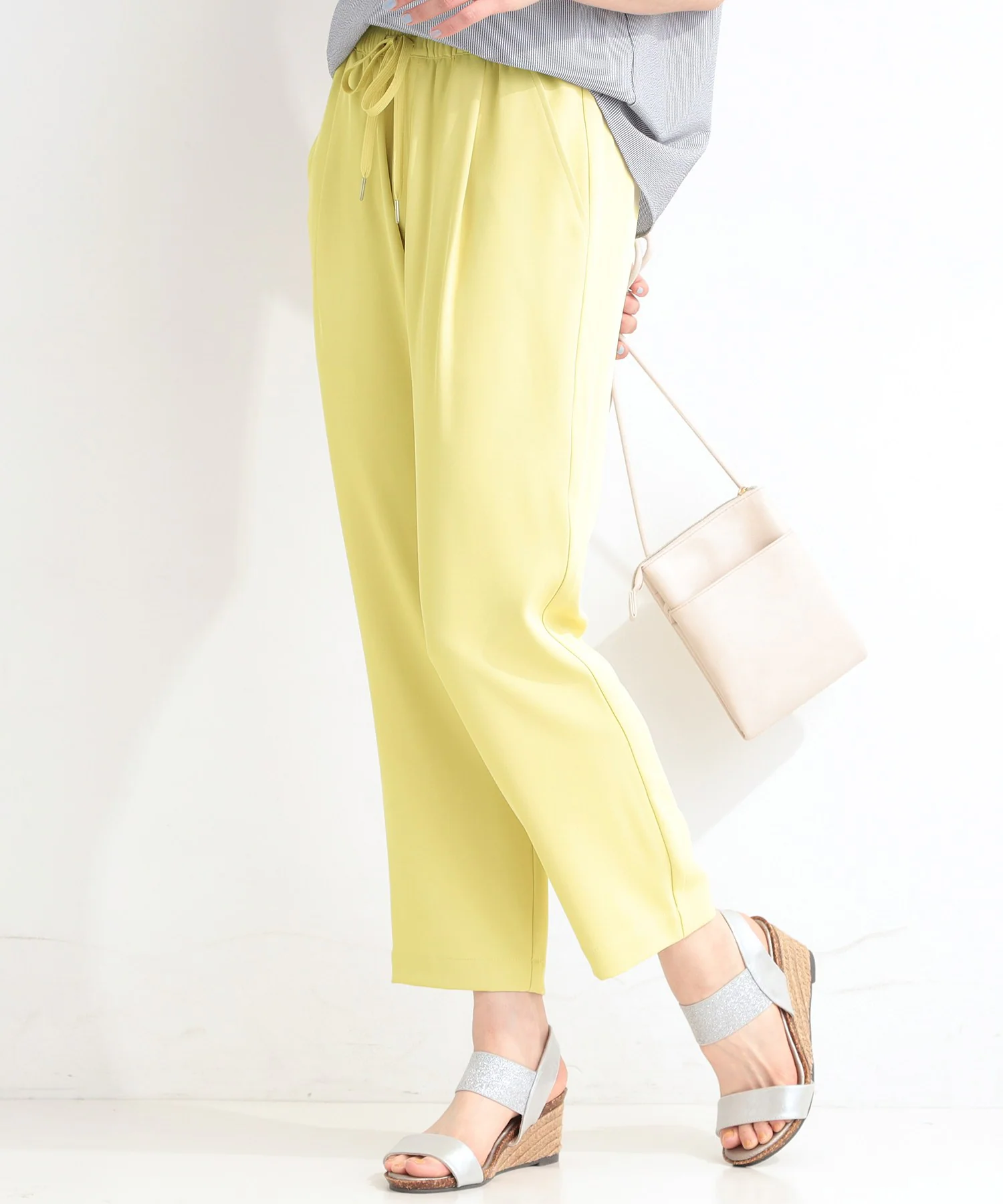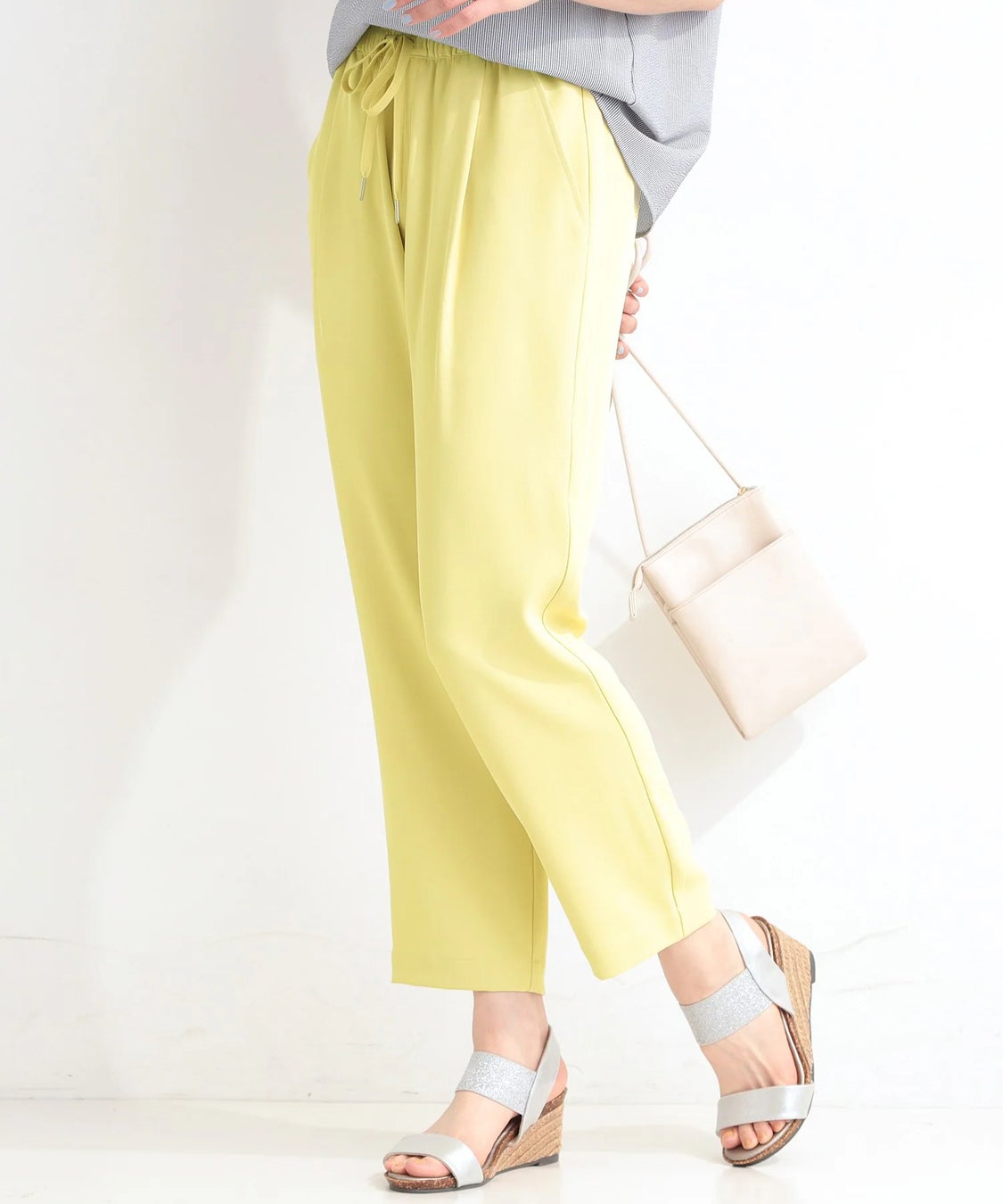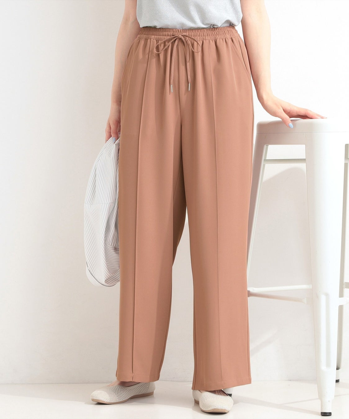 腰回りはゆったりとした楽な着用感で、センターに施したピンタックが足のラインを美しく見せてくれます。ウエスト部分は嬉しいゴム仕様で、ドロストでのサイズ調節も可能。着脱も簡単で、ストレスフリーな一着です。ドロストがポイントのウエストデザインなので、トップスをインしても様になります。また、ブラウス合わせでお仕事シーンにも活躍します。