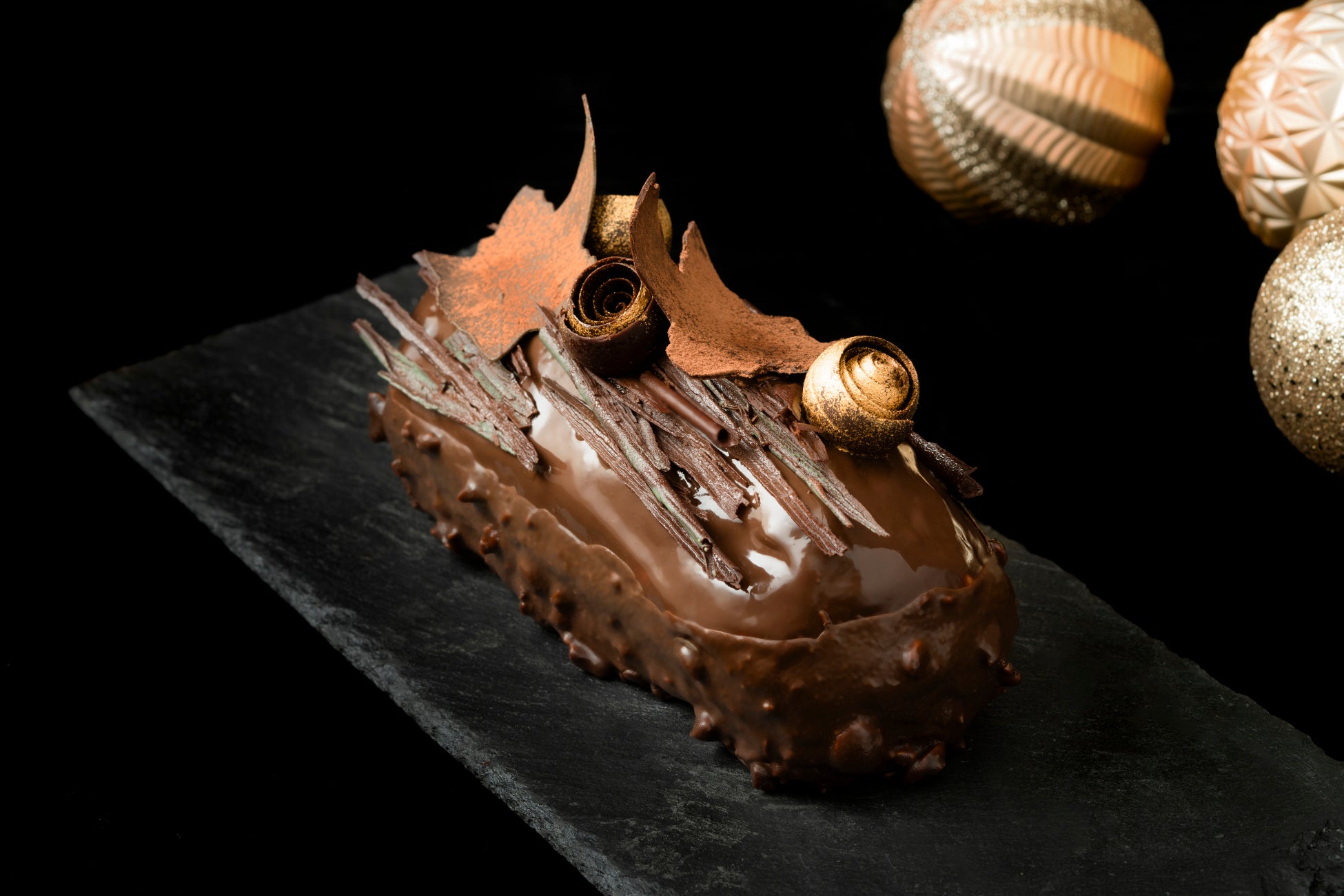 クリスマスの象徴であるブッシュ・ド・ノエルの伝統的な味わいにさらなる洗練を加えた一品に仕上げました。チョコレートの名門 ヴァローナ製のカカオ分70%クーベルチュールチョコレートのクリームを贅沢に使用し、ふんわりとしたスポンジで丁寧に巻き上げました。チェリーコンポートのほのかな酸味がクリームに華やかなアクセントを添え、スターアニス(八角)の風味が奥深い味わいを演出します。スーシェフ・藤田の個性が光る独創的なアレンジが施されたリッチで贅沢な味わいをお楽しみください。