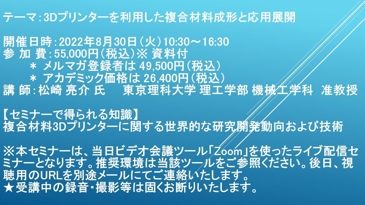先端技術情報や市場情報を提供している(株)シーエムシー・リサーチ(千代田区神田錦町: https://cmcre.com/ )では、 各種材料・化学品などの市場動向・技術動向のセミナーや書籍発行を行っておりますが、 このたび「3Dプリンターを利用した複合材料成形と応用展開」と題するセミナーを、 講師に松崎 亮介 氏 東京理科大学 理工学部 機械工学科 准教授)をお迎えし、2022年8月30日(火)10:30より、 ZOOMを利用したライブ配信で開催いたします。 受講料は、 一般:55,000円(税込)、 弊社メルマガ会員:49,500円(税込)、 アカデミック価格は26,400円(税込)となっております(資料付)。