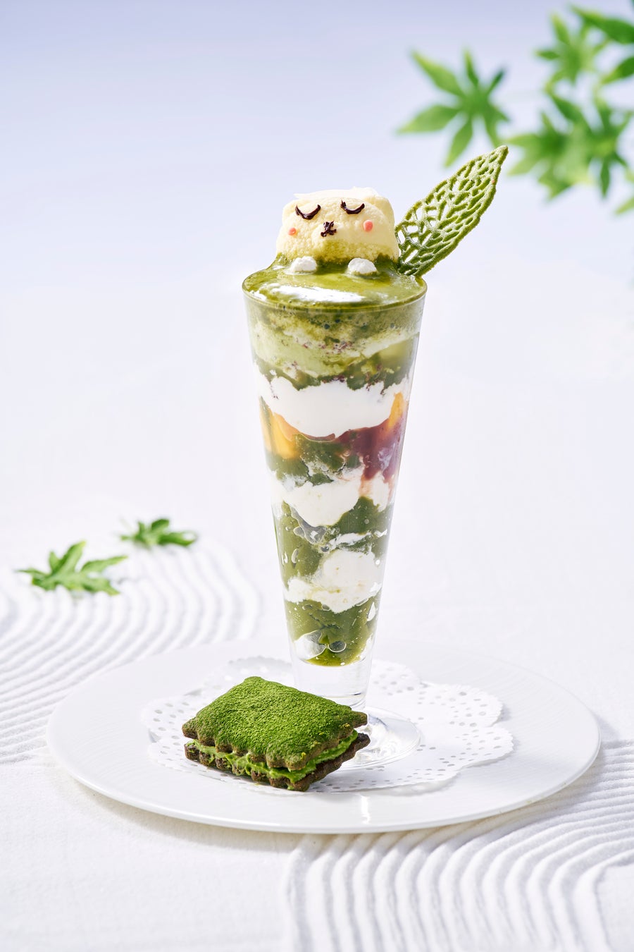 「うとうと くまっちゃパフェ」は抹茶ゼリーとミルクゼリーが美しく層を成すグラスの中に、あんこや抹茶のレアチーズケーキ、バニラアイスクリームを贅沢に盛り込みました。さらに軽やかな口どけの抹茶エスプーマがふわっと広がり、抹茶の温泉につかった可愛らしいクマちゃんが、見た目にも癒しと遊び心を演出します。