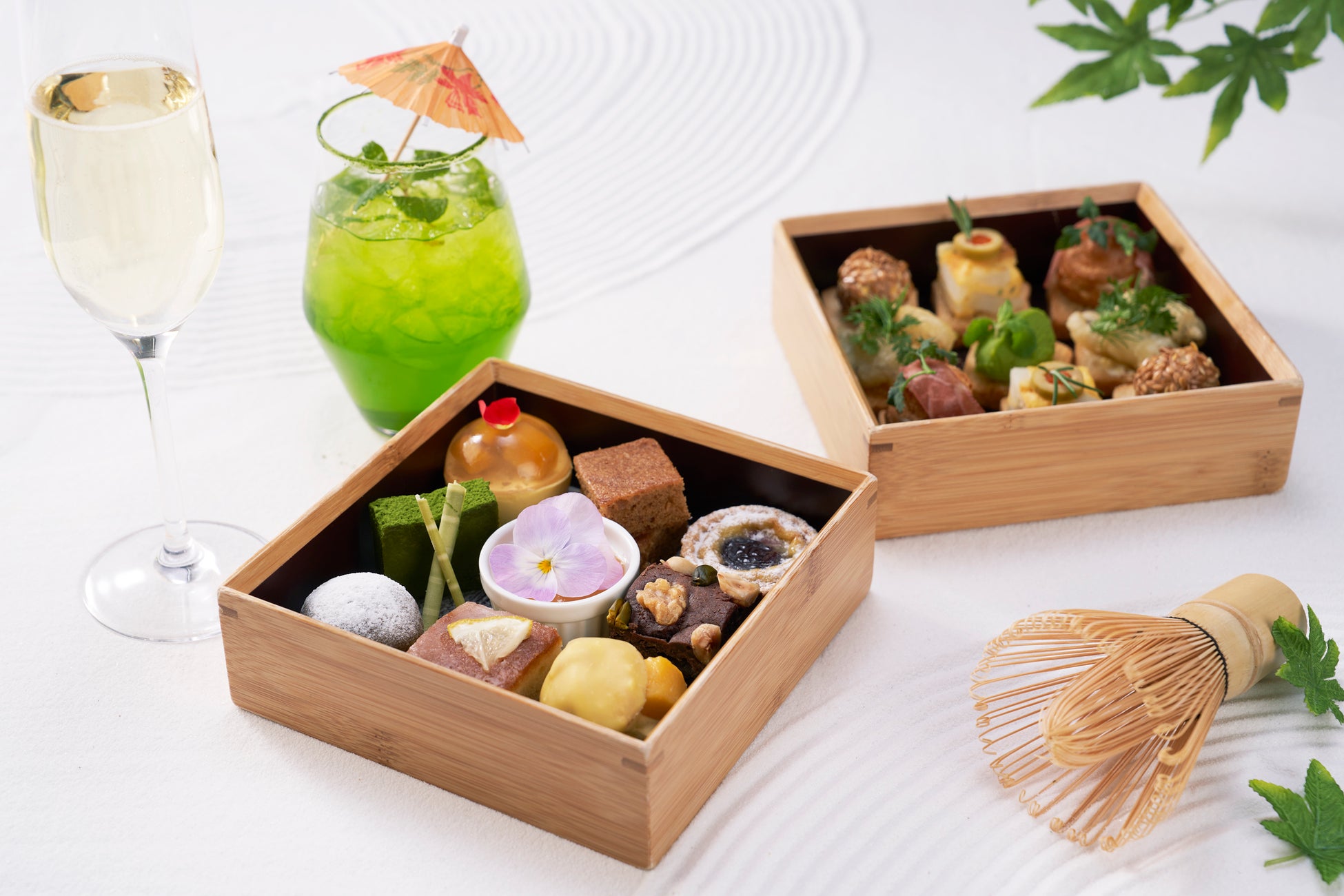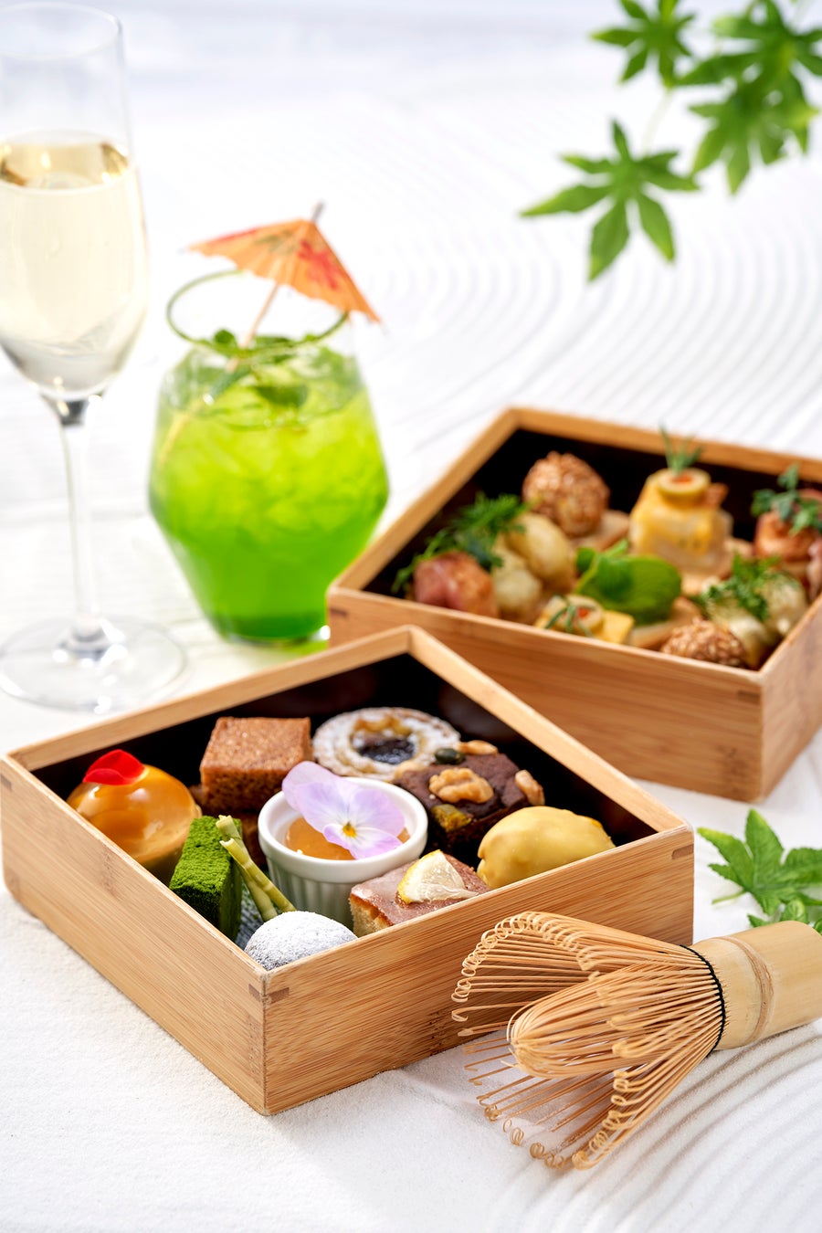 「はんなりアフタヌーンティーセット」は、旬の素材を活かしたスイーツ9種とセイボリー9品をご用意しました。抹茶のテリーヌやほうじ茶のスノーボールといった新緑の時季にぴったりな深みのあるデザートが愉しめる一方で、マンゴームースやチェリークラフティといったフルーティーで爽やかなスイーツも登場します。