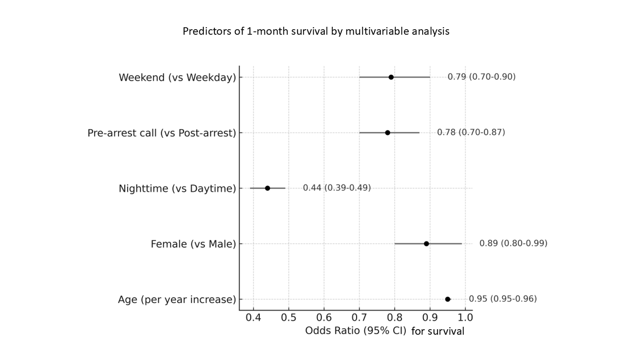 ・夜間発生(調整オッズ比0.44)とpre-arrest call(調整オッズ比0.78)が、1か月生存の低下と関連
