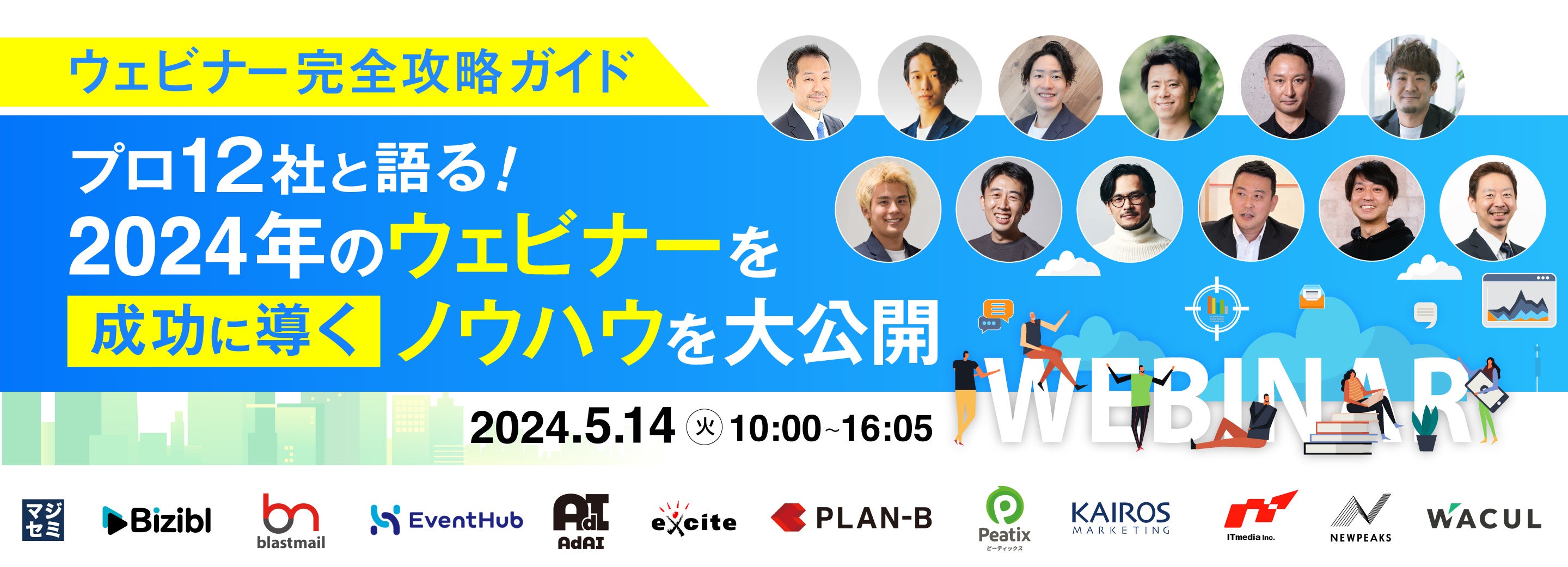 こんな悩みを抱えている担当者の方も多いはずです。そこで本セミナーでは、ウェビナーのプロフェッショナル12社が集結し、ウェビナーを成功に導くための秘訣を惜しみなく明かします。基礎から応用まで様々な手法や実践的なノウハウ、そして未来のトレンドにも焦点を当てて解説します。「ウェビナー」に特化したオンラインカンファレンスでは、日本最大級となっておりますので是非お申し込みくださいませ!