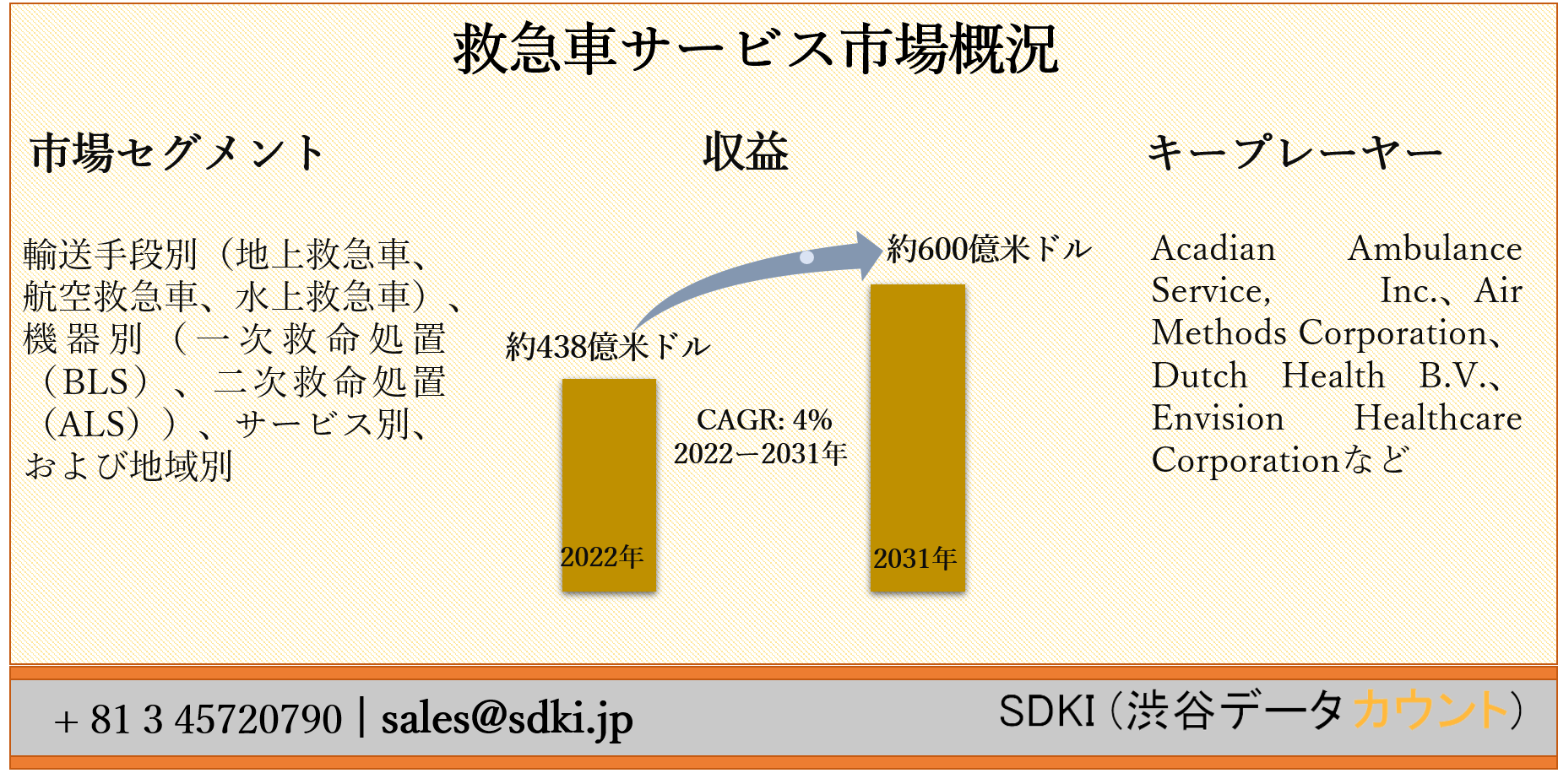 SDKI Inc.が「救急車サービス市場ーグローバルな予測2022ー2031年」の新調査レポートを2022年02月18日に発刊しました。レポートは、業界の新ビジネスチャンスとともに、市場とその成長見通しの完全な評価を提供します。さらに、2022ー2031年の予測期間中の市場規模と年間成長率が含まれています。