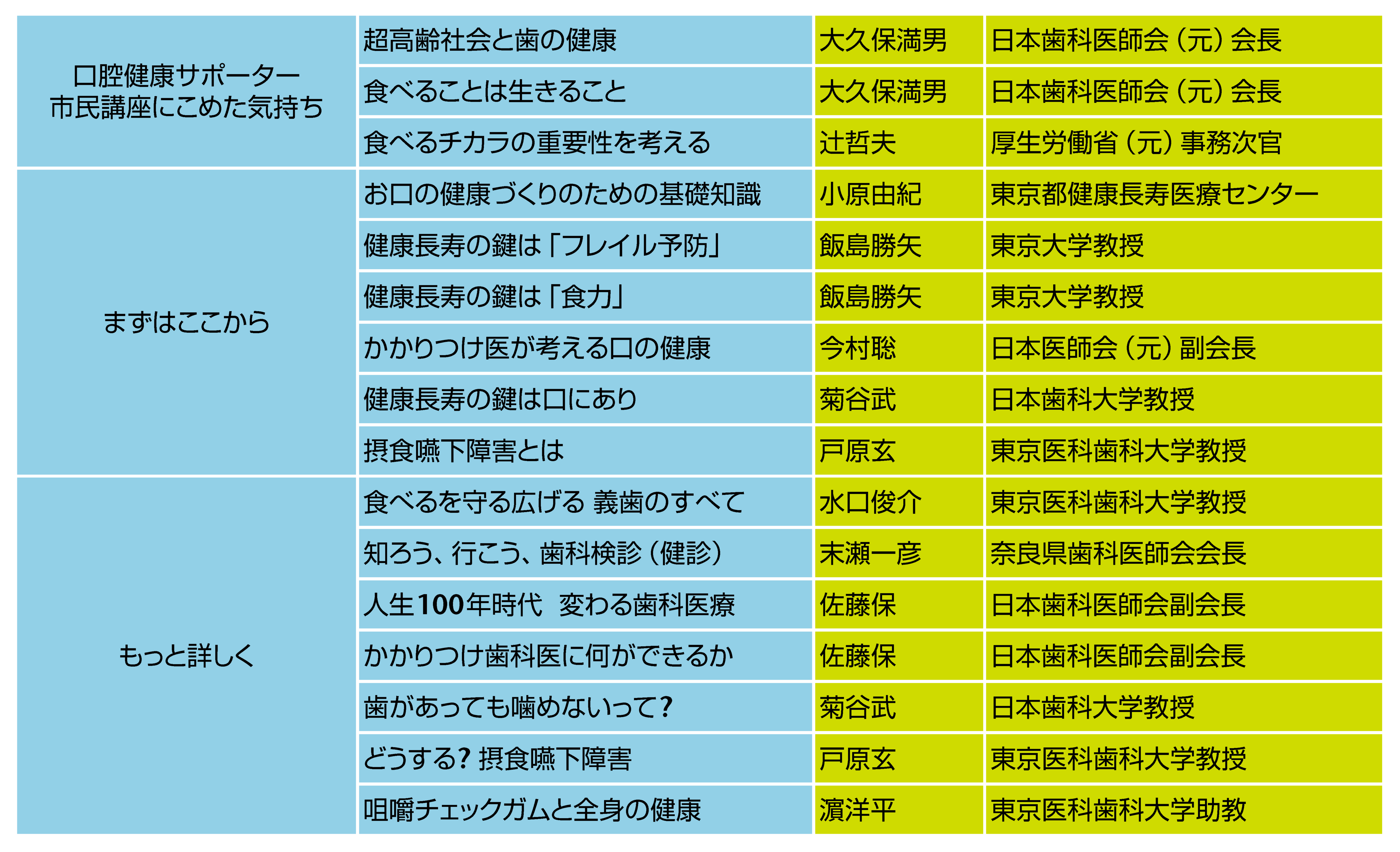 本日「超高齢社会と歯の健康」(大久保満男)、「食べるチカラの重要性を考える」(辻哲夫)など、16本の市民講座を公開し、今後も様々な講座を順次公開予定です。また、受講後に簡単なオンラインのミニテストを受けていただき、合格した方には「口腔健康サポーターバッチ」をお送りする企画も準備中です。今後の本会の活動にご期待ください。