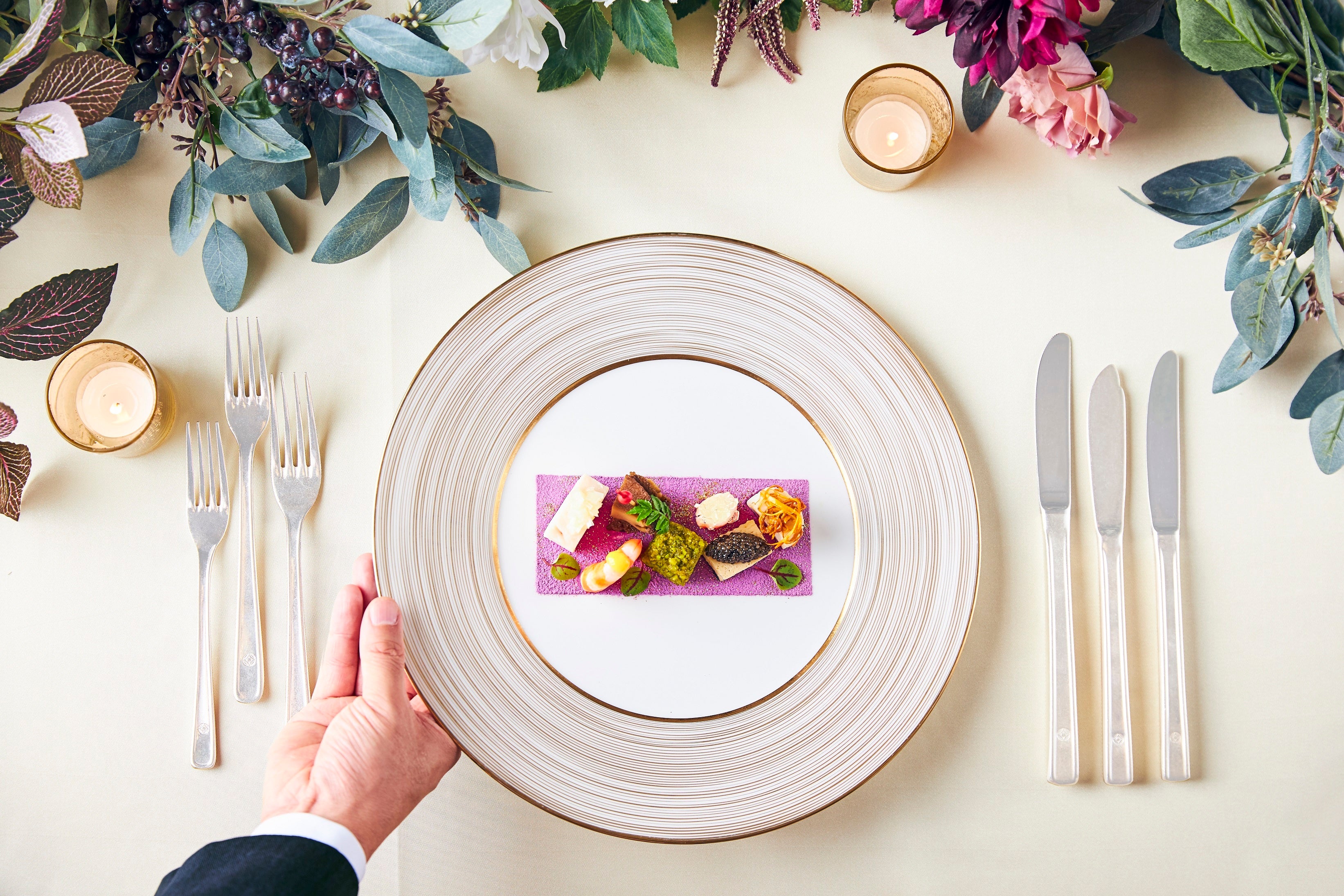 天井高6.8m、かつ広々とした空間だから叶う演出の数々を「模擬披露宴」でご紹介。最長13.5mにもなる巨大スクリーンで映し出す、感動のハイライト上映や、ゲストの目の前で披露する「燃え上がる炎のフランベ演出」をなど“五感で愉しめる”フランス料理はフルコースでご用意いたします。リニューアルしたばかりの会場で、ニューオータニウエディングを存分にご体感いただける一日です。