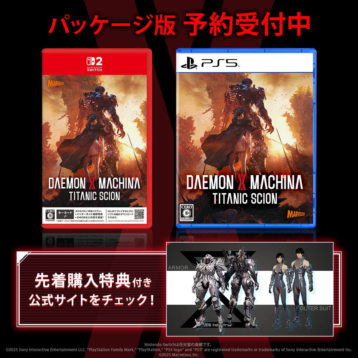 9月5日発売のNintendo Switch™ 2 /PlayStation®5/Xbox Series X|S /Steam®向けメカアクションゲーム『DAEMON X MACHINA TITANIC SCION(デモンエクスマキナタイタニックサイオン)』では、Nintendo Switch 2 / PlayStation®5パッケージ版が予約受付中です。