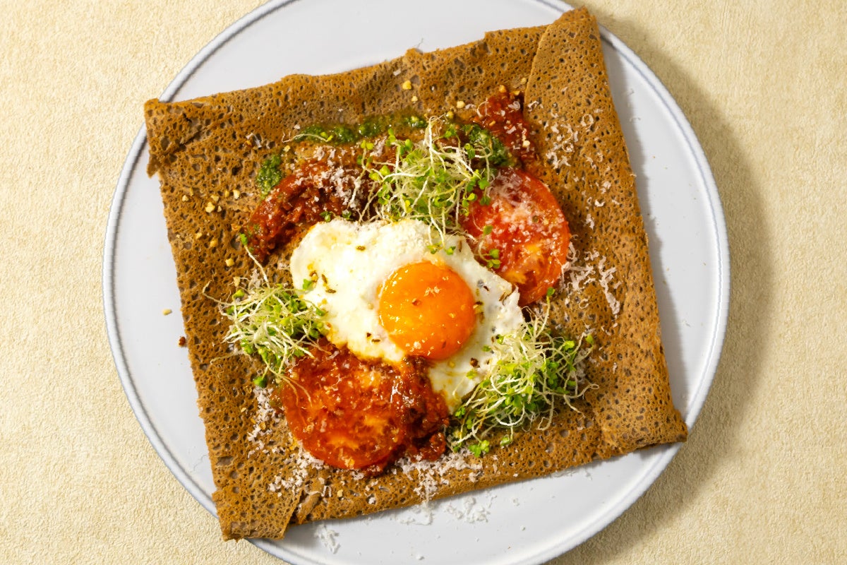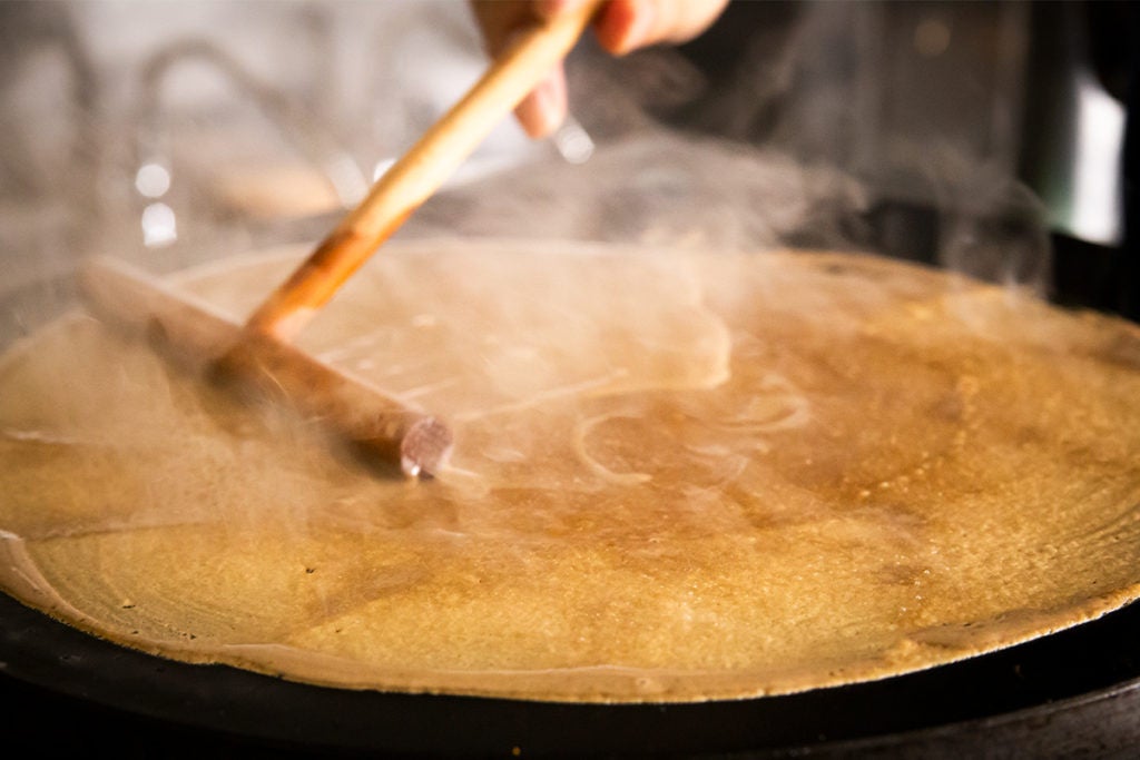 厳選した香り高いそば粉と、兵庫・赤穂の塩、フランス産のシードル、卵を使用したシェフこだわりの生地を使用。高温の鉄板で一枚一枚丁寧に焼き上げるガレットは、表面はパリッと、そば粉の香りが引き立つ味わいが特徴です。