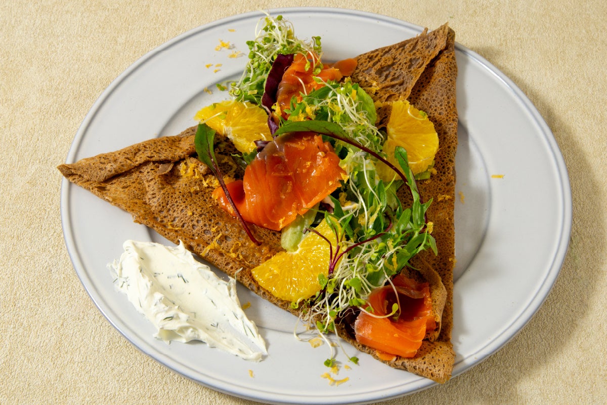 スモークサーモンにオレンジ、ハーブなどの野菜をたっぷりと合わせた彩り鮮やかなサラダガレット。味のアクセントに添えたハーブクリームをお好みで付けてお楽しみください。