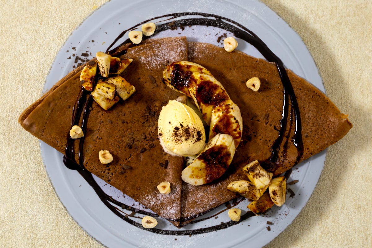 甘い香りのもっちりショコラ生地に、キャラメリゼしたバナナと濃厚なバニラアイス、ヘーゼルナッツを添えて。ショコラ好きにはたまらないデザートクレープです。
