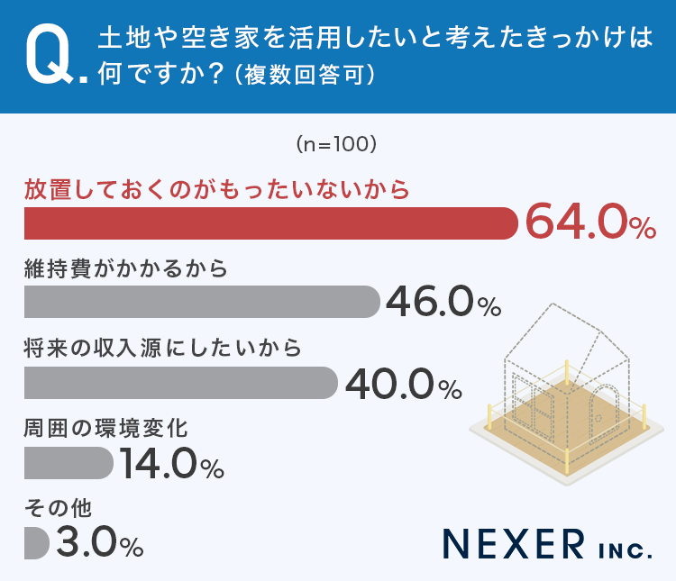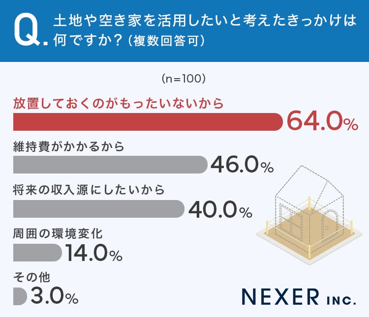 最も多くの方が挙げたのは「放置しておくのがもったいないから」で、64%と過半数を占めました。