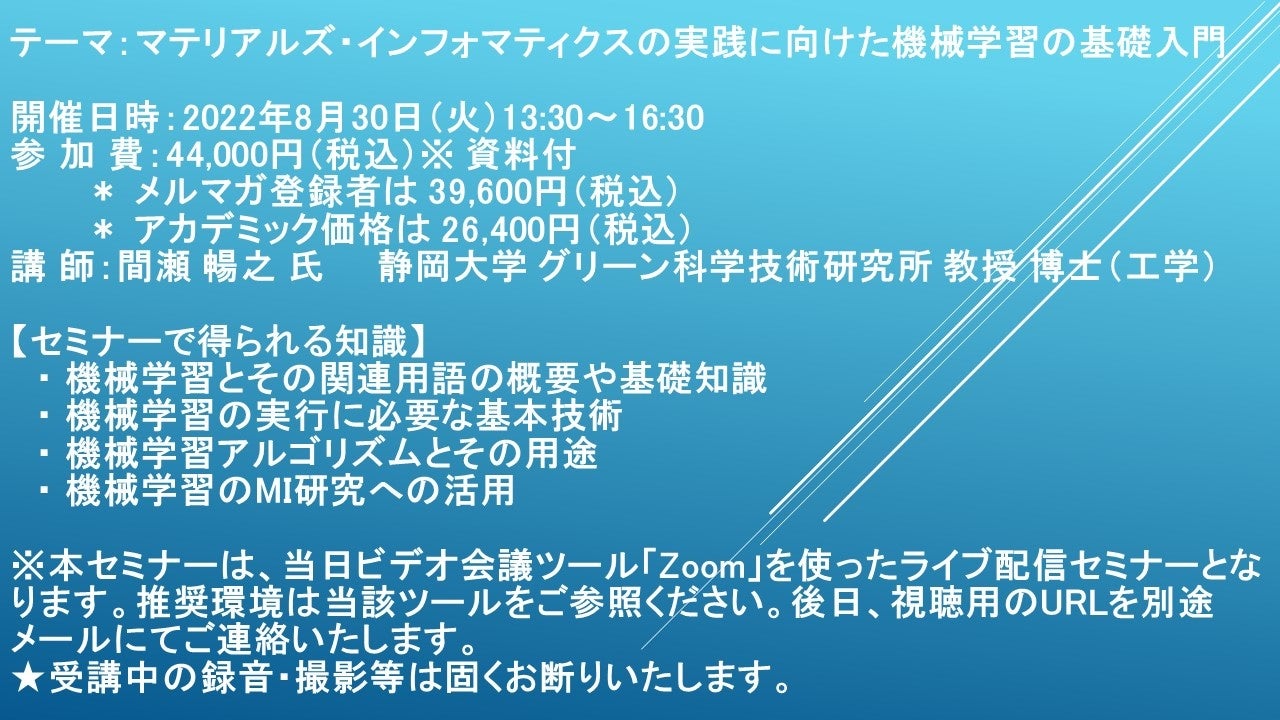 先端技術情報や市場情報を提供している(株)シーエムシー・リサーチ(千代田区神田錦町: https://cmcre.com/ )では、 各種材料・化学品などの市場動向・技術動向のセミナーや書籍発行を行っておりますが、 このたび「マテリアルズ・インフォマティクスの実践に向けた機械学習の基礎入門」と題するセミナーを、 講師に野田 祐輔 氏 岡山県立大学 情報工学部 情報通信工学科 准教授)をお迎えし、2022年8月30日(火)13:30より、 ZOOMを利用したライブ配信で開催いたします。 受講料は、 一般:44,000円(税込)、 弊社メルマガ会員:39,600円(税込)、 アカデミック価格は26,400円(税込)となっております(資料付)。