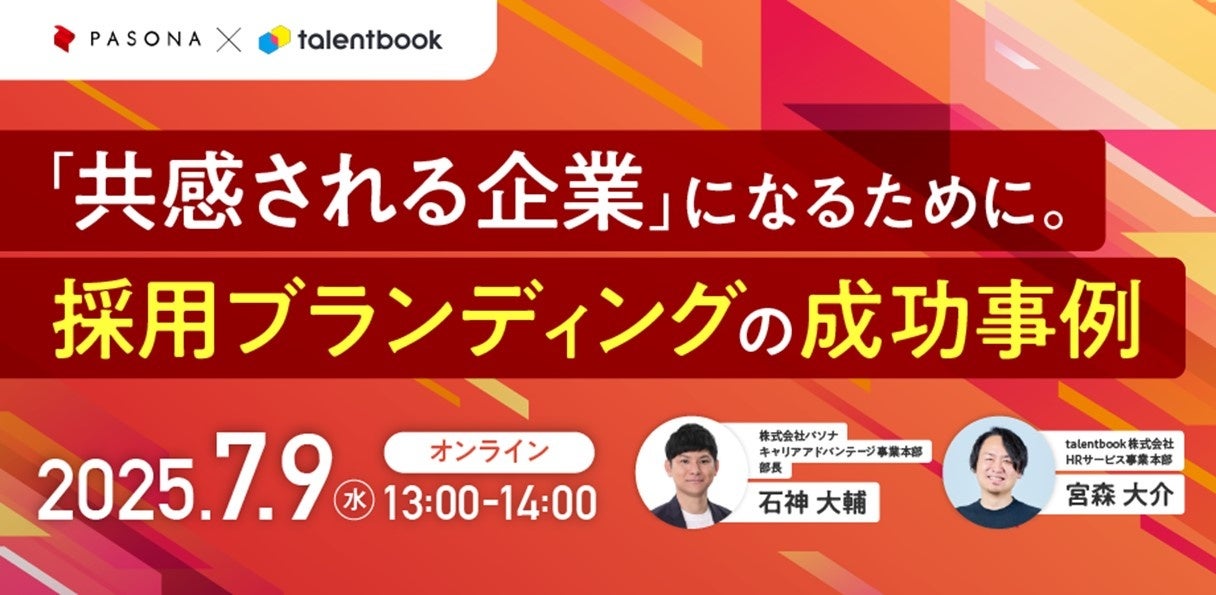株式会社パソナは、採用に関わる経営層の方、人事のご担当者様へ向けたウェビナー「『共感される企業』」になるために。採用ブランディングの成功事例』を7月9日(水)に開催いたします。