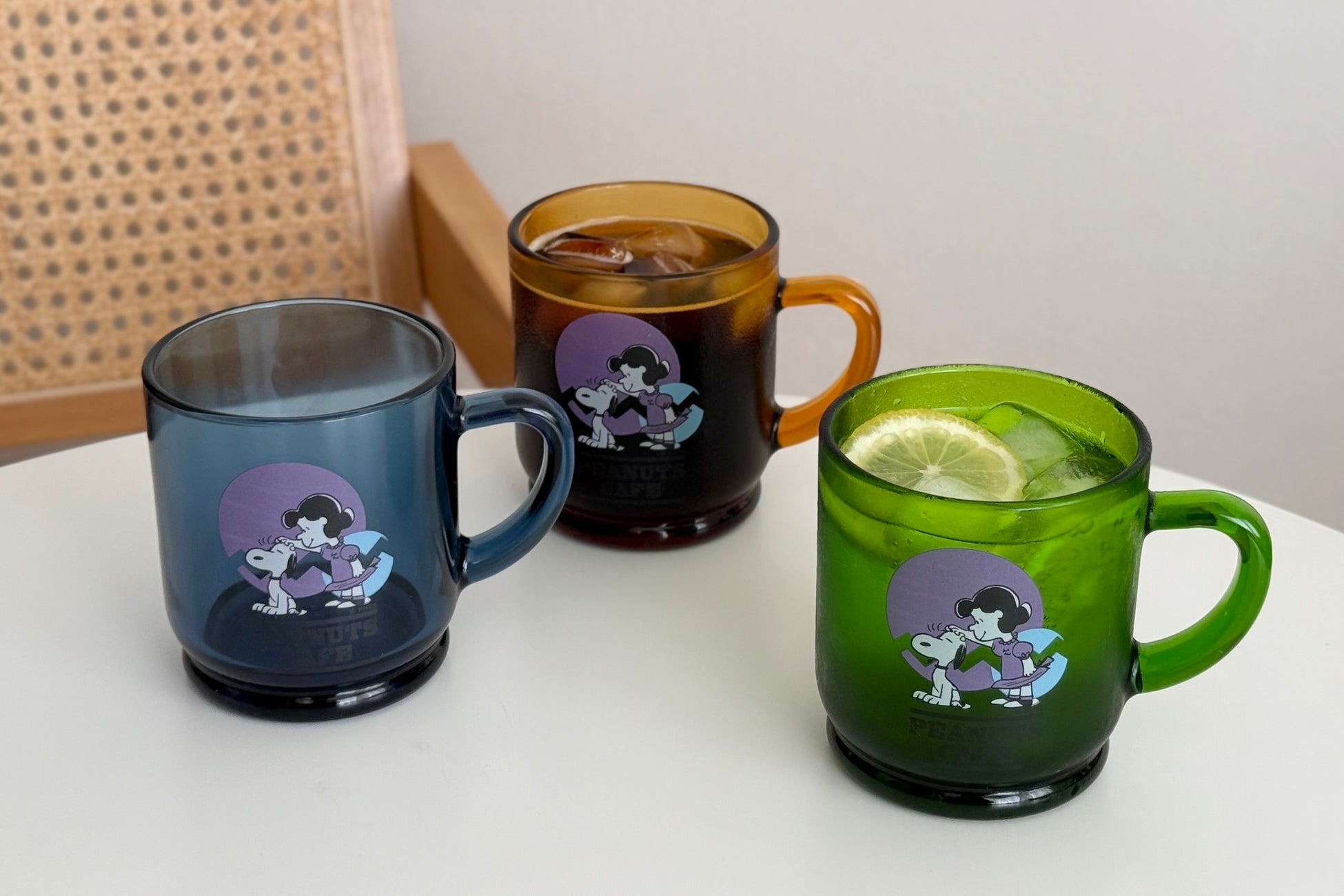 スヌーピーとルーシーが施された、ガラスの鮮やかな色合いと透け感が美しいマグカップ。