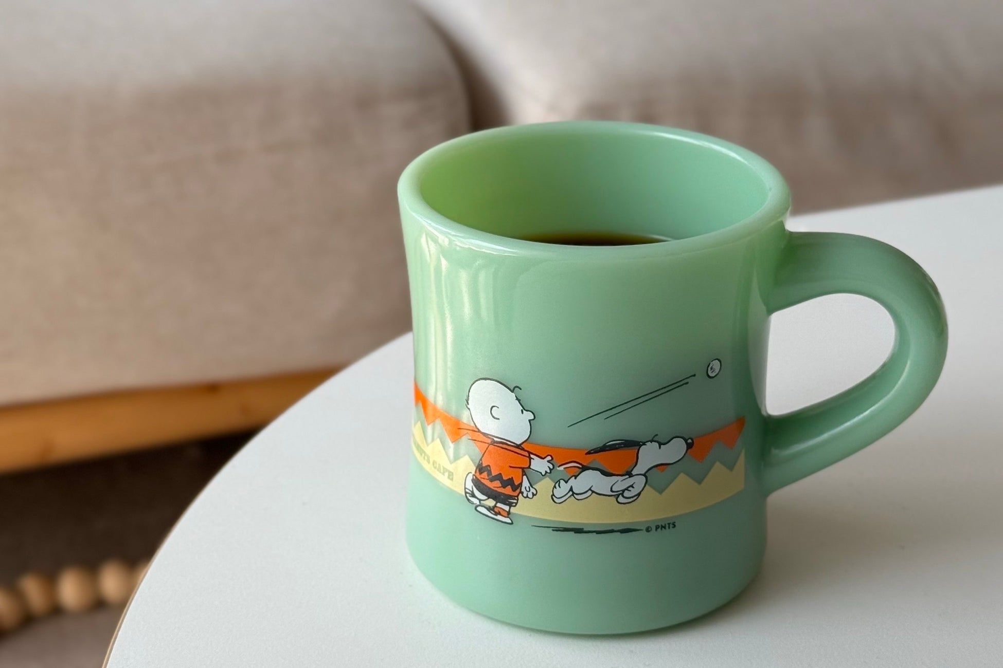 スヌーピーとチャーリー・ブラウンのレトロモダンなデザインを施したミルキーカラーのマグカップ。