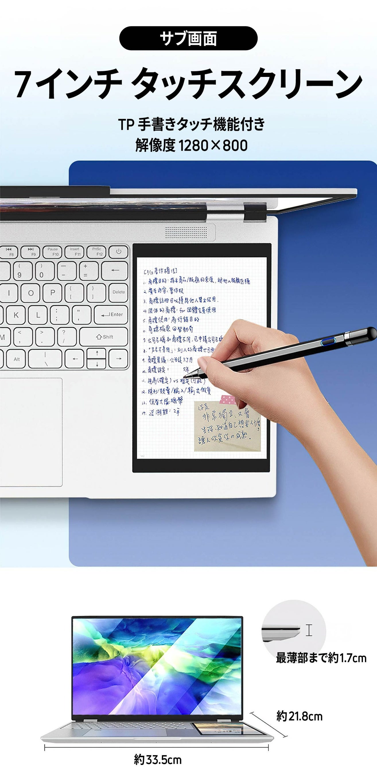 RevoPadの7インチサブ画面はタッチスクリーンで手書き機能も備えています。メイン画面とサブ画面の2画面構成により、より作業効率が高まります。