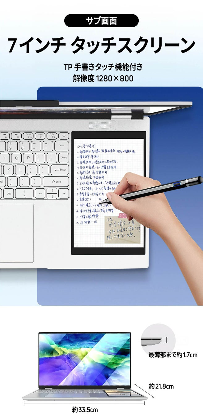 「RevoPad(レボパッド)」は、15.6インチのメイン画面と7インチのタッチスクリーンサブ画面を持つ2画面構造のノートPCです。