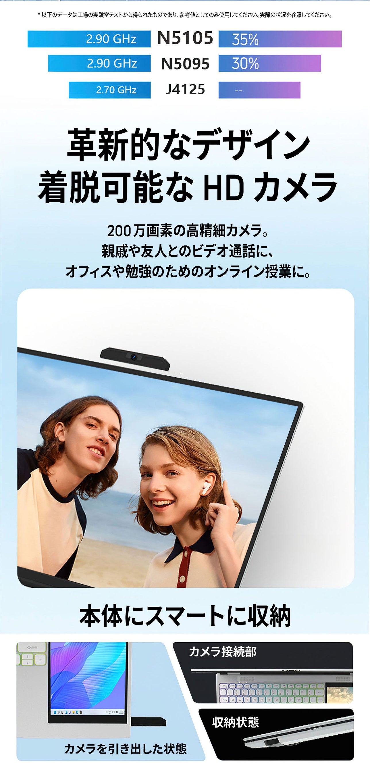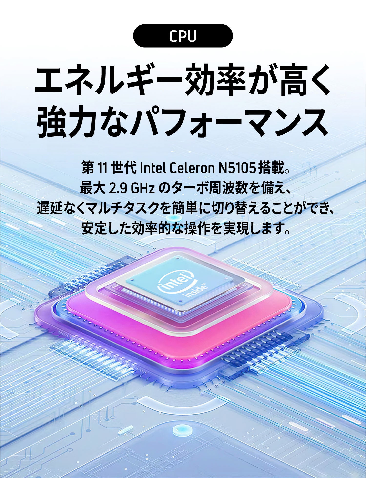 CPU | インテル Celeron N5105 クアッドコア 2.0GHZ、ターボ 2.9GHz、10nm |