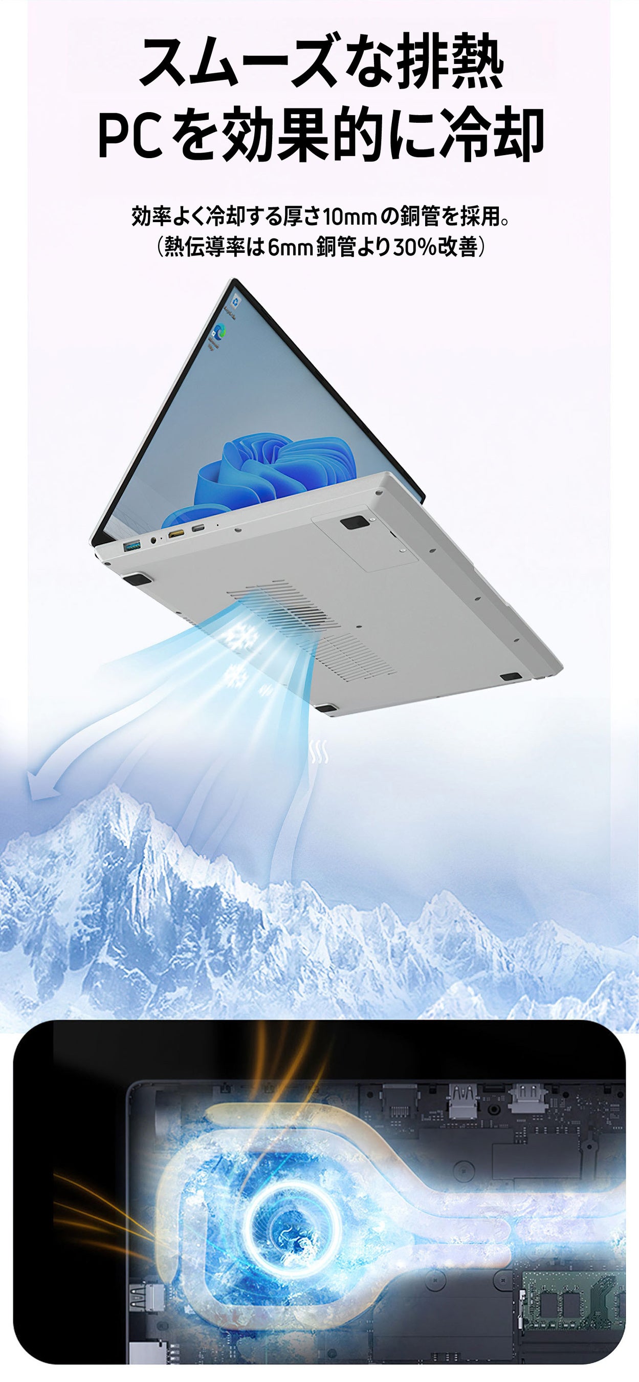 RevoPadはPCを効率よく放熱する厚み10mmのヒートパイプ構造を採用しています。