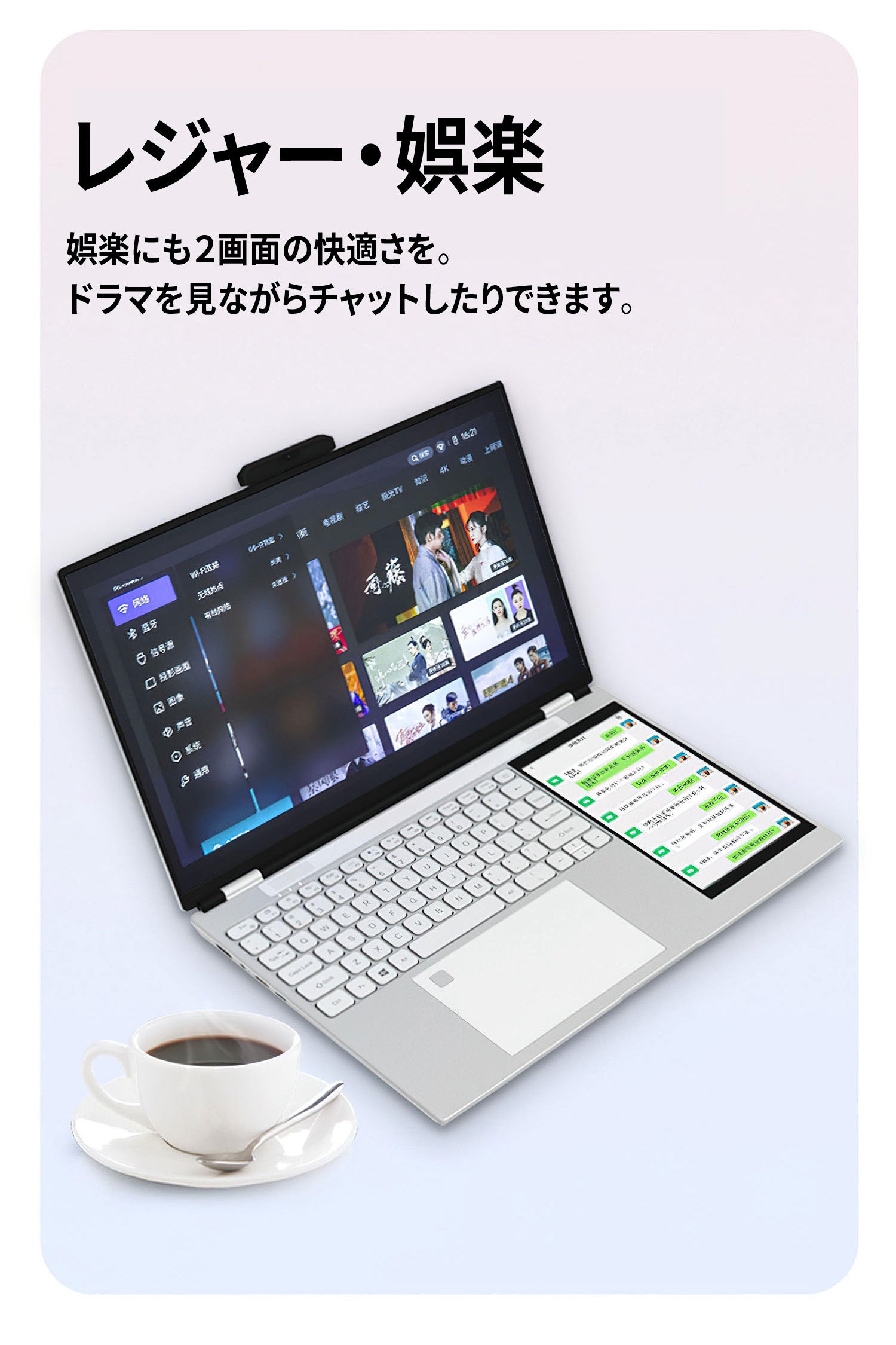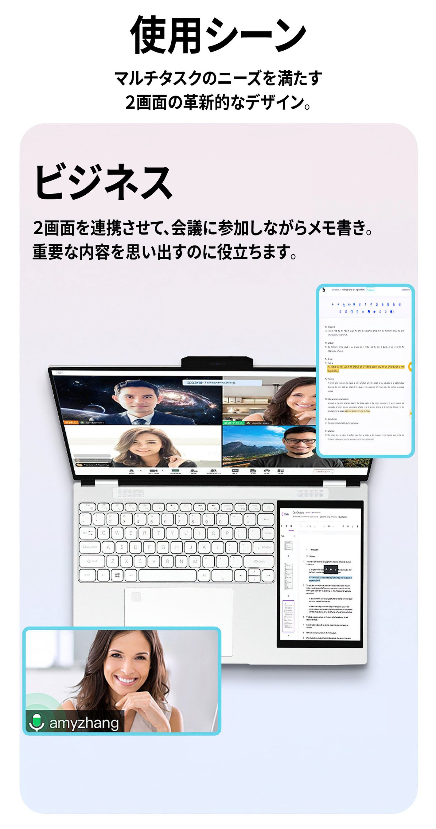 二画面構造と高いパフォーマンスはマルチタスクを容易にし、エクセルやパワーポイントなどのオフィスツールの効率的な使用を可能にします。