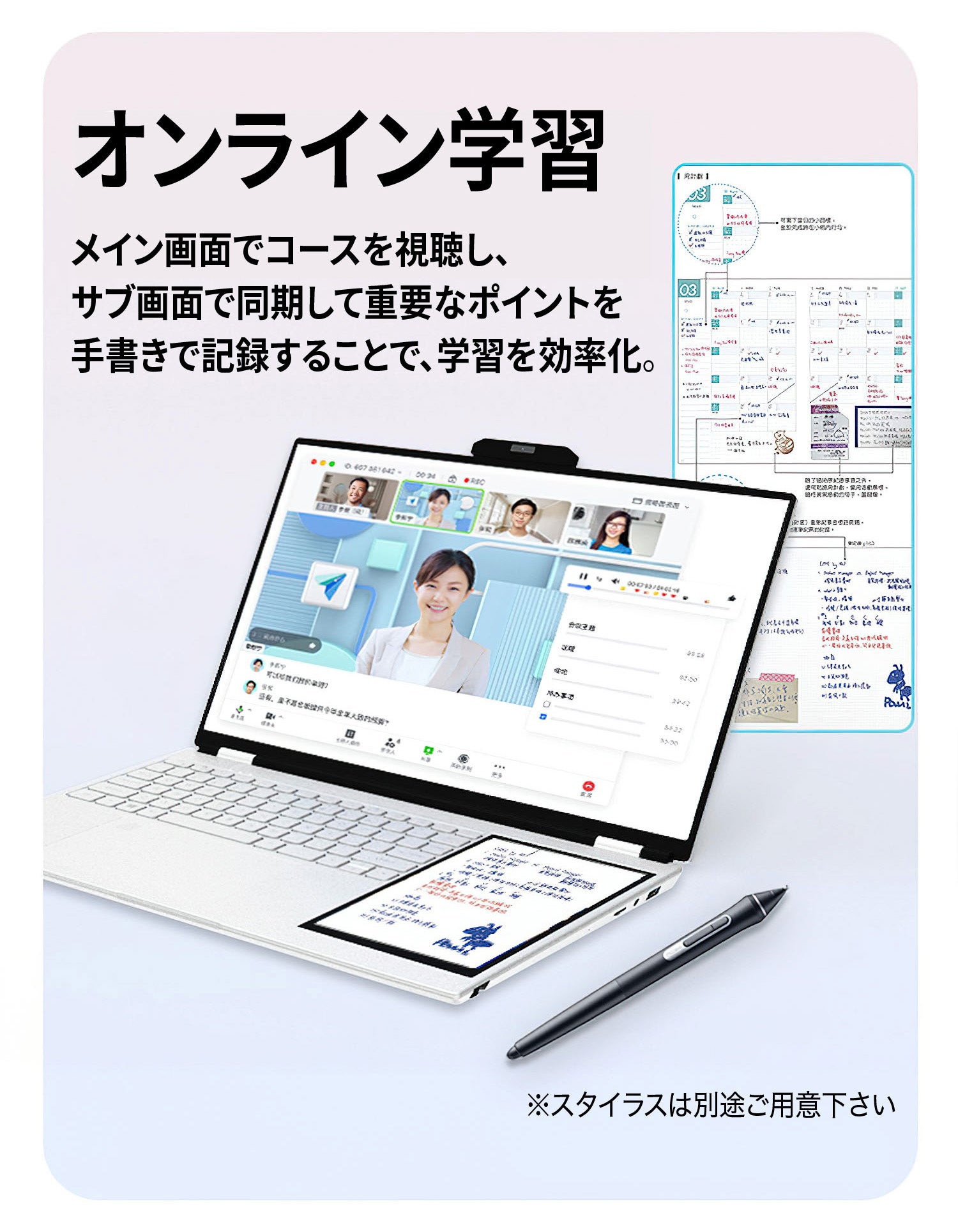 タッチスクリーン用のスタイラスも付属しており、メモ書きやクリエイティブ作業にすぐに使えます。