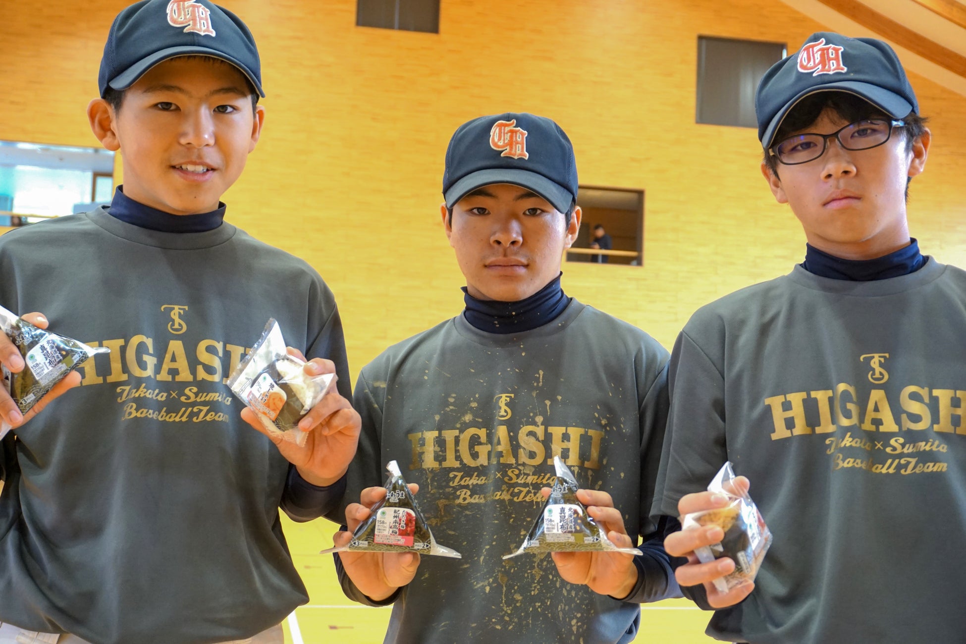 10月12日(日)に、当選校のひとつである岩手県陸前高田市立高田東中学校 野球部にも、おむすびを差し入れました。大谷翔平選手の出身地であり、同じく野球部で日々練習に励む部活生にサプライズで届けられたおむすびは、こどもたちに喜ばれ、明るく元気な雰囲気に包まれました。