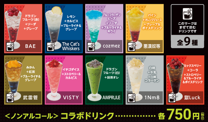 コラボドリンクは、「Paradox Live」の各グループ「BAE」「The Cat’s Whiskers」「cozmez」「悪漢奴等」「武雷管」「VISTY」「AMPRULE」「1Nm8」「獄Luck」をイメージした全9種【各750円(税込)】をご用意します。