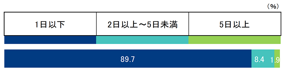 学生が参加した件数全体のうち「1日以下」のプログラムは89.7%で、「5日以上」は1.9%であった