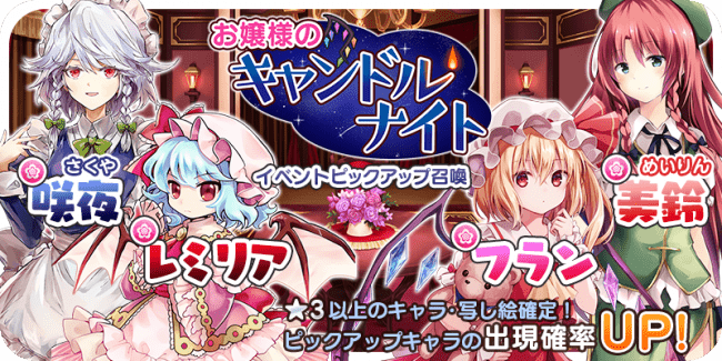 『東方キャノンボール』、11月6日(水)15:00より期間限定イベント「お嬢様のキャンドルナイト」と「お嬢様のキャンドルナイトピックアップ召喚」を開催!