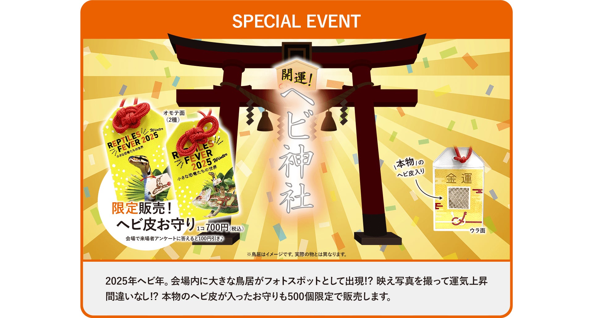 2025年、巳年を迎え初のレプタイルズフィーバーはさらにパワーアップ。今年の主役「ヘビ」がたくさん展示・販売されるこのイベントに「開運!ヘビ神社」を設立します。