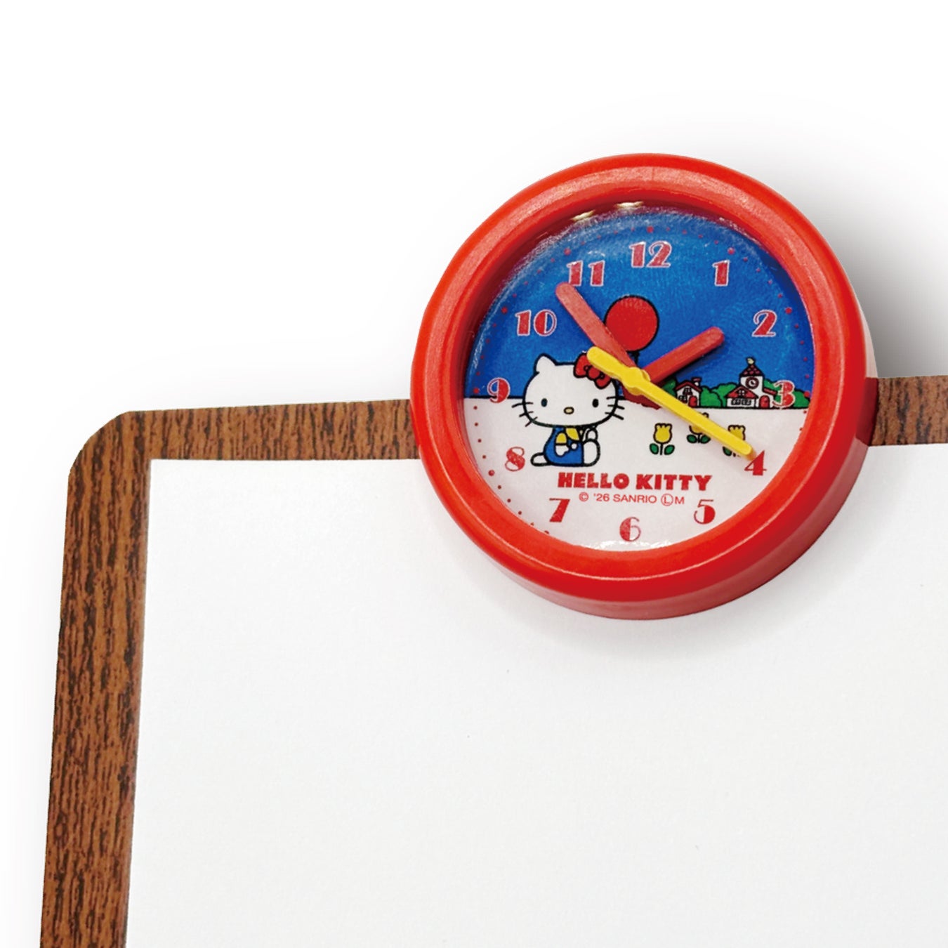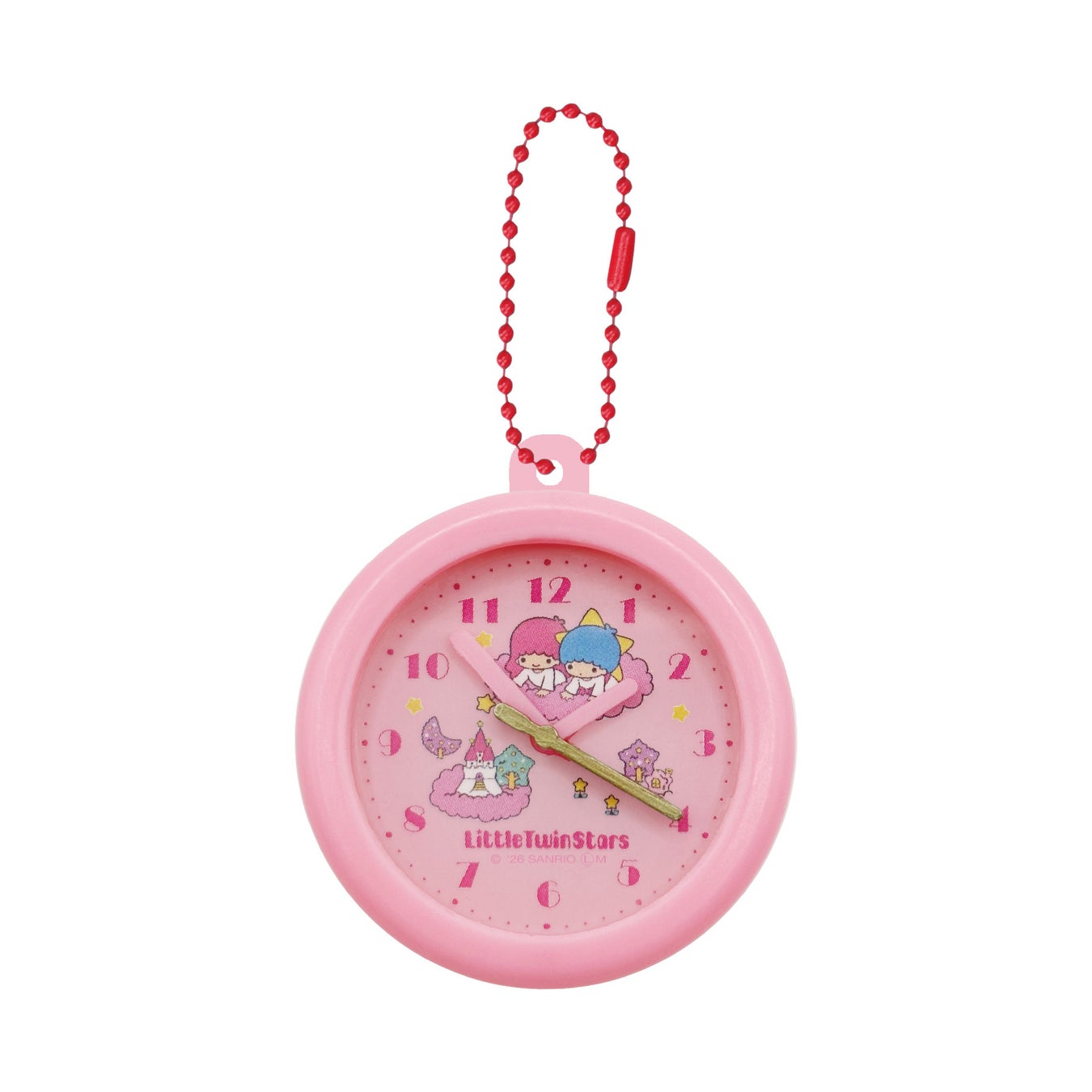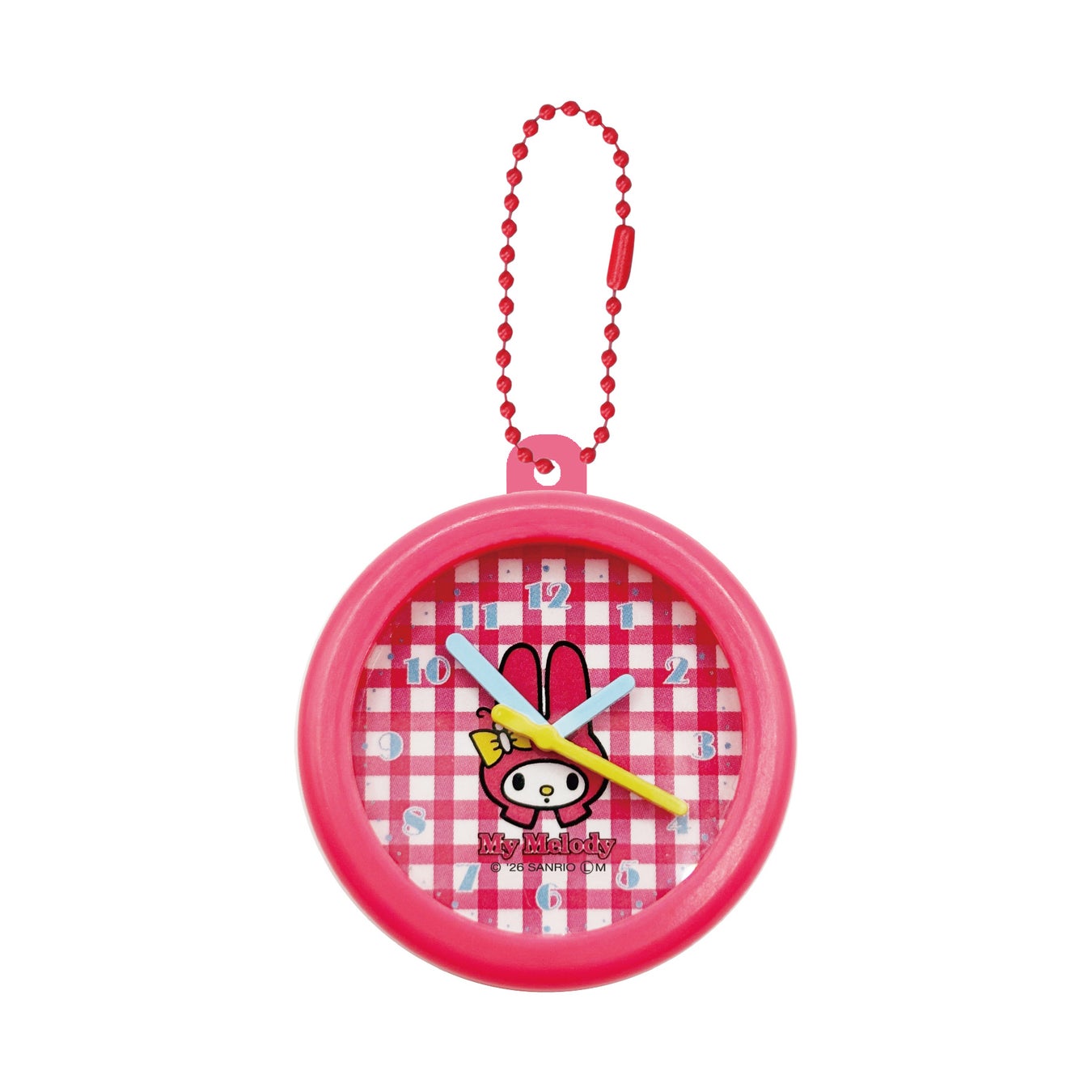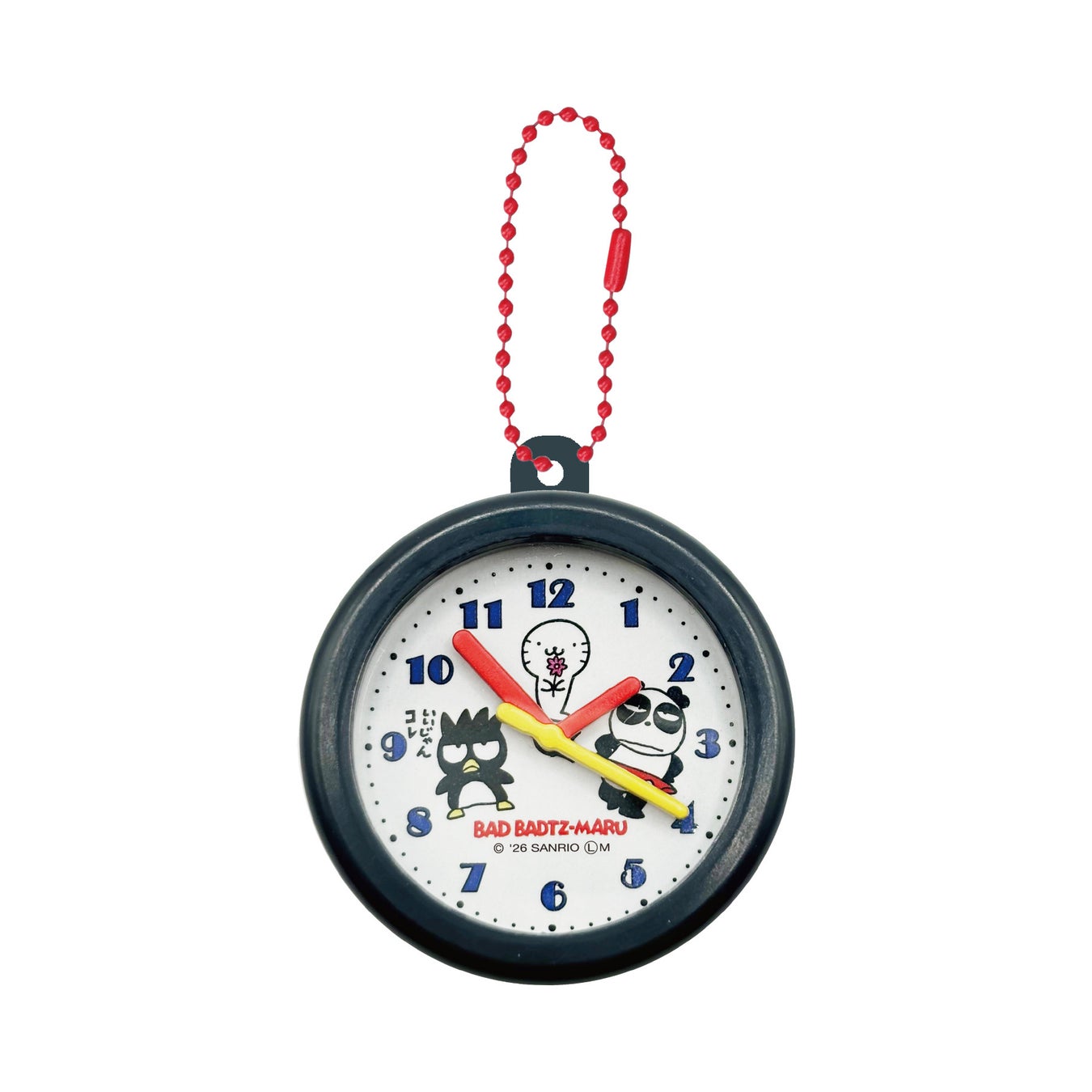 どこかレトロなデザインの丸い壁掛け時計を、そのままミニチュアにしたようなアイテムです。「ハローキティ」「マイメロディ」「ポムポムプリン」「リトルツインスターズ」「バッドばつ丸」「けろけろけろっぴ」の全6種がラインアップ。全キャラクターの顔が見やすいように配置した時針と分針は、1時53分(いちごさん)を指しています。