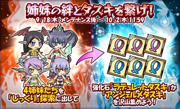 手に入れた4姉妹の使用人を「探索(じっくり)」に出すと、4姉妹に応じたチームの強化石「タスキ」を必ず1個手に入れて帰ってきます。探索に出した回数や獲得した強化石の数に応じ、達成報酬のイベントアイテムをゲットできます。
