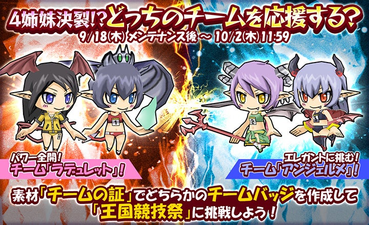 アクションパズルRPG『ケリ姫スイーツ』は、応援するチームを選んで対決する新イベント「どっちの味方!?4姉妹のマラソンバトル!」を2025年9月18日(木)より開催いたします。