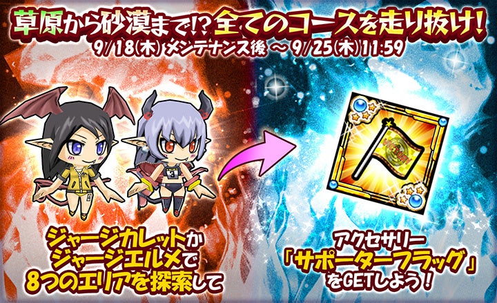 また、「ジャージカレット」か「ジャージエルメ」を対象の8つのエリアへ「探索」に出すと、達成報酬としてアクセサリー「サポーターフラッグ」をゲットできるチャンスです。