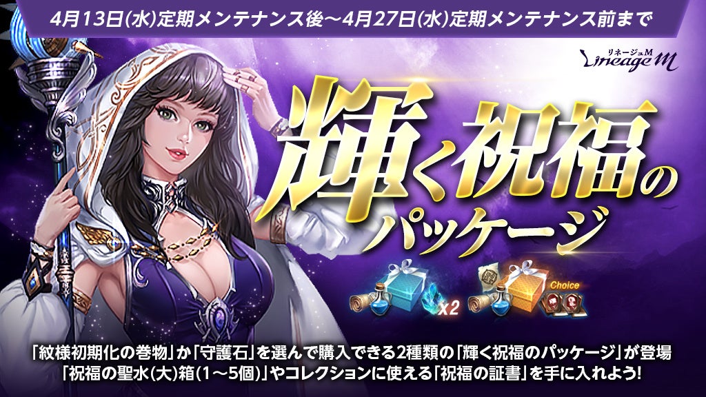 本パッケージには「輝く祝福のパッケージ(紋様初期化)」と「輝く祝福のパッケージ(守護石)」が含まれており、両パッケージともに「祝福ポイント」1,000を獲得できる「祝福の聖水(大)箱(1~5個)」と、永久性コレクションまたは期間性のコレクションの材料として使用できる「祝福の証書」がセットになっています。