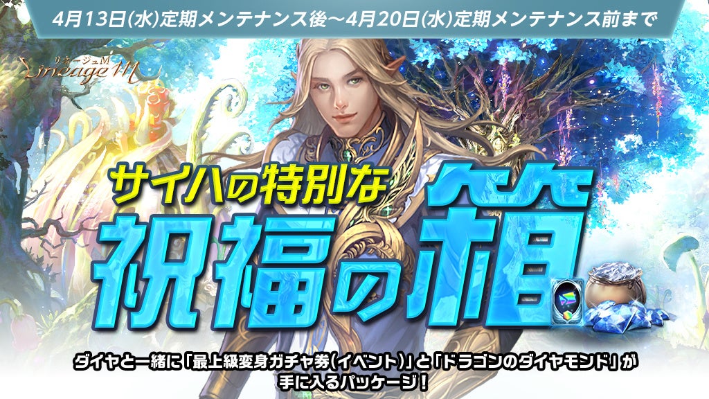ダイヤに加え、「最上級変身ガチャ券(イベント)」、「ドラゴンのダイヤモンド」が獲得できる「サイハの特別な祝福の箱」が登場しました。