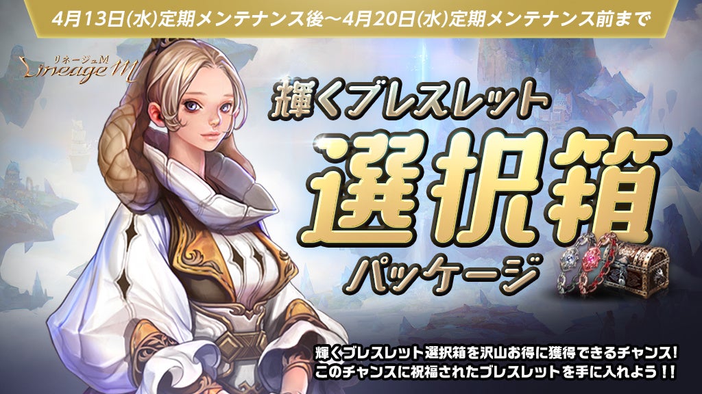 PCオンラインRPG「リネージュ」のモバイル版タイトル『Lineage M(以下、リネージュM)』のサービス、運営をしているエヌ・シー・ジャパン株式会社(東京都港区、代表取締役:金 澤憲(キム テクホン) 以下、エヌシージャパン)は、2022年4月13日にイベント「春のパイン祭り」や「ハーディンのテレポートの一部入場費用緩和」などの開催に加え、対象ブレスレットへの「祝福」付与や、「輝くブレスレット選択箱パッケージ」、「輝く祝福のパッケージ」などの様々な商品が登場したことをお知らせします。
