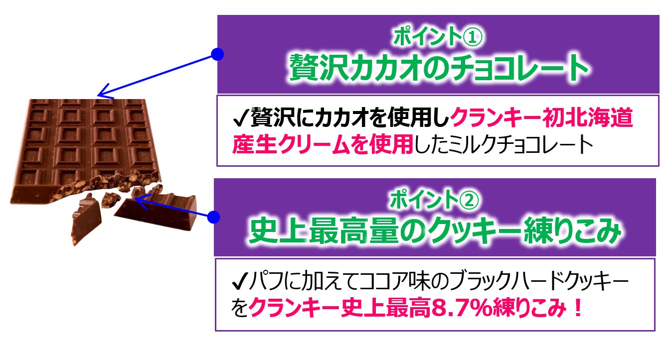 2.北海道産生クリームを使用し、クランキー史上最も贅沢にカカオを使用したチョコレートに、ザクザク食感のクッキーをクランキー史上最高量で練りこみ、やみつきな美味しさに仕上げました。