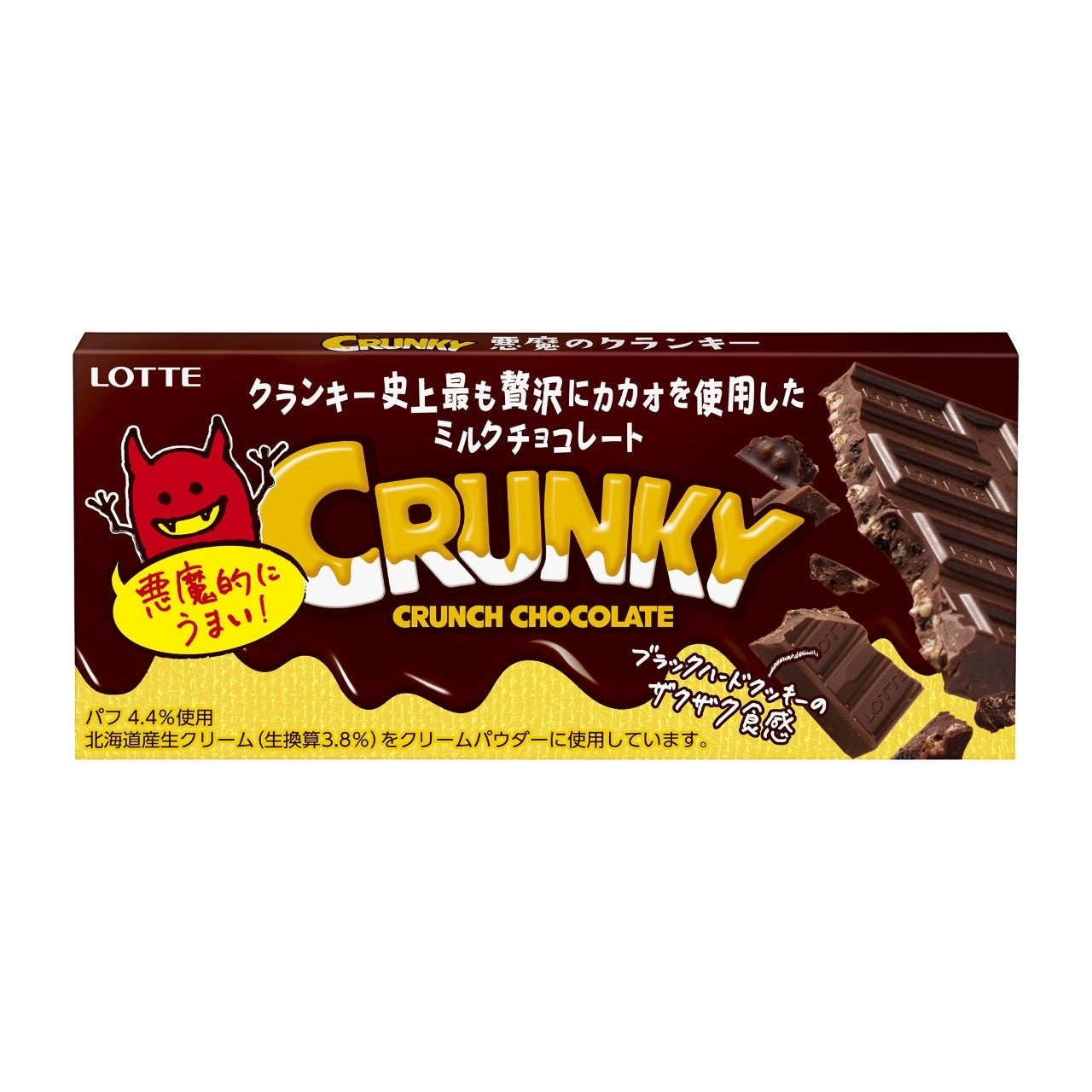 株式会社ロッテは3月28日(火)に、サクサク食感でおなじみの「クランキー」シリーズから贅沢にカカオを使用したミルクチョコとザクザク食感のクッキーが悪魔的うまさの「悪魔のクランキー」を発売いたします。やみつきなおいしさが新しいクランキーを、ぜひお楽しみください。