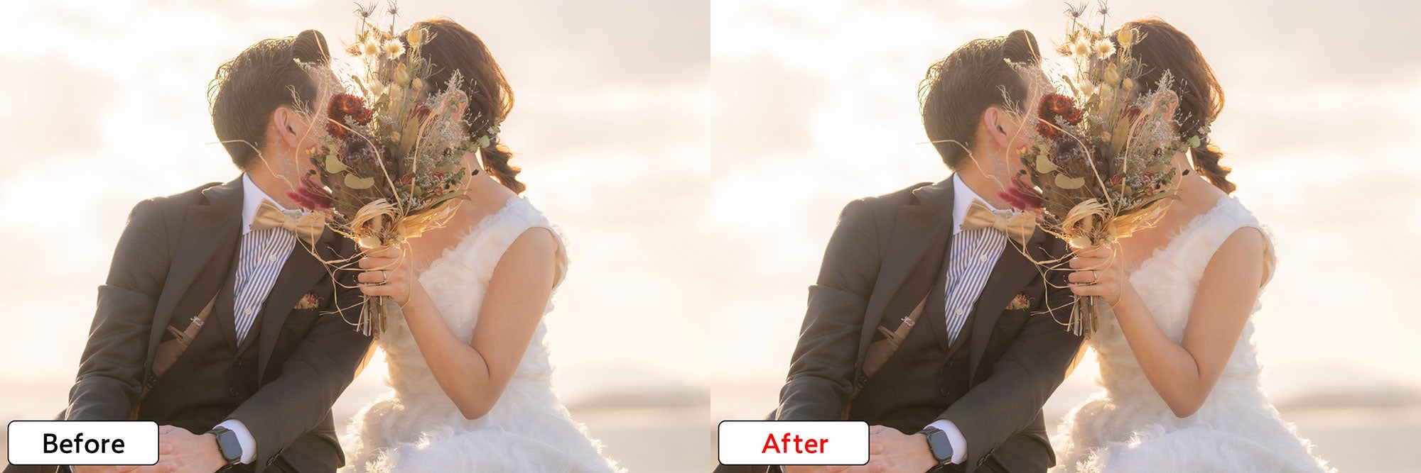 従来の顔全体およびパーツごとの大きさ・形の調整や、全身バランスを整えるスタイルアップと合わせて活用することで、ウェディングフォトもお客様ご自身でこだわってレタッチができ、世界観にあった自然な盛りが実現します。