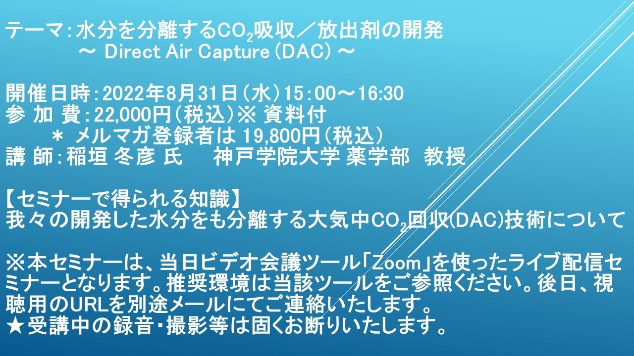 【ライブ配信セミナー】水分を分離するCO2吸収/放出剤の開発 ~ Direct Air Capture (DAC) ~ 8月31日(水)開催 主催:(株)シーエムシー・リサーチ
