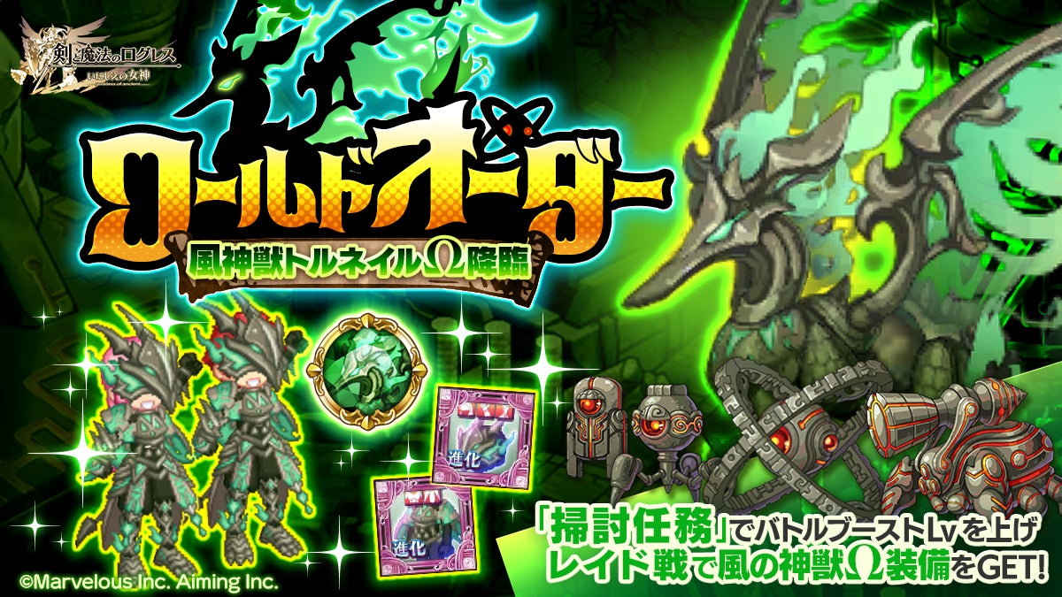 株式会社マーベラス(代表取締役社長:照井 慎一/所在地:東京都品川区)は、スマートフォン向け本格オンラインRPG『剣と魔法のログレス いにしえの女神』において、2025/4/30(水)に「ワールドオーダー 風神獣トルネイルΩ降臨」の開催を、2025/5/1(木)に新武器を追加した「ジョブ別 クレイドル確率アップガチャ」の販売を含むアップデートを行ったことをお知らせいたします。
