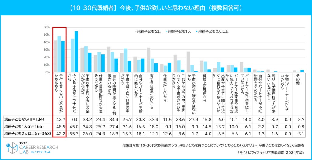 子どもを欲しいと思わない理由をみると、「現在子どもなし」「現在子ども1人」の人で最も多かったのは、「子どもを育てるのにお金がかかるから」(「子どもなし」42.7%/「子ども1人」48.5%)だった。「現在子ども2人以上」の人でみても、最多項目は「今いる子どもだけで十分だから(55.3%)」だが、次いで多かったのは「子供を育てるのにお金がかかるから(42.2%)」だった。
