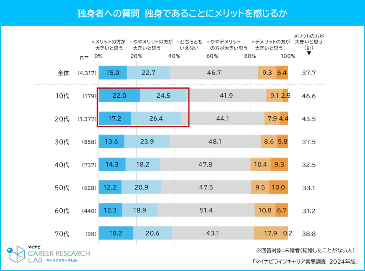 未婚者に対して独身であることへの考えを聞いたところ、メリットの方が大きいと思う人は37.7%だった。年代別で最もメリットを感じているのは10代で46.6%、次いで20代で43.5%となった。