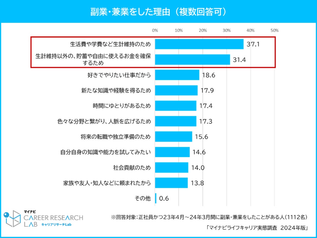 副業・兼業をした理由は「生活費や学費など生計維持のため(37.1%)」「貯蓄や自由に使えるお金を確保するため(31.4%)」が上位となった。物価高の影響もあり、正社員としての本業の所得のみでは生計を立てられない状況も推察される。