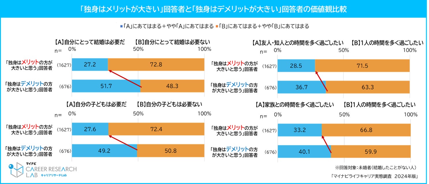独身はメリットの方が大きいと思う人の価値観をみてみると「デメリットが大きいと思う」回答者と比べて「結婚/子どもは必要ない」「(家族や友人との時間よりも)1人の時間を多く過ごしたい」という傾向が強くみられた。【図5、6】