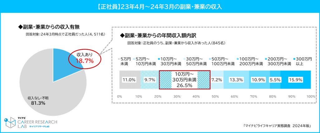 正社員のうち、副業・兼業の収入があった人は18.7%でおよそ5人に1人にあたる。年間収入をみると「10~30万円未満」が26.5%で最も多かった。