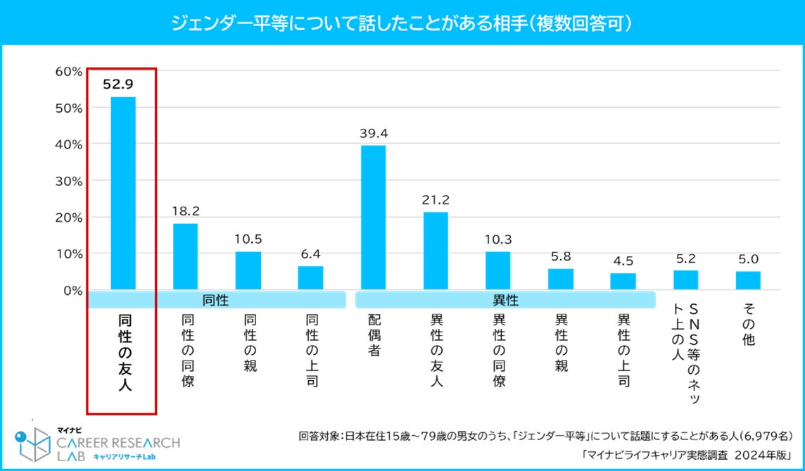 また、ジェンダー平等に関して話題にしたことがある人に、話している相手を聞いたところ「同性の友人」が52.9%で過半数を超え、最多となった。【図2】